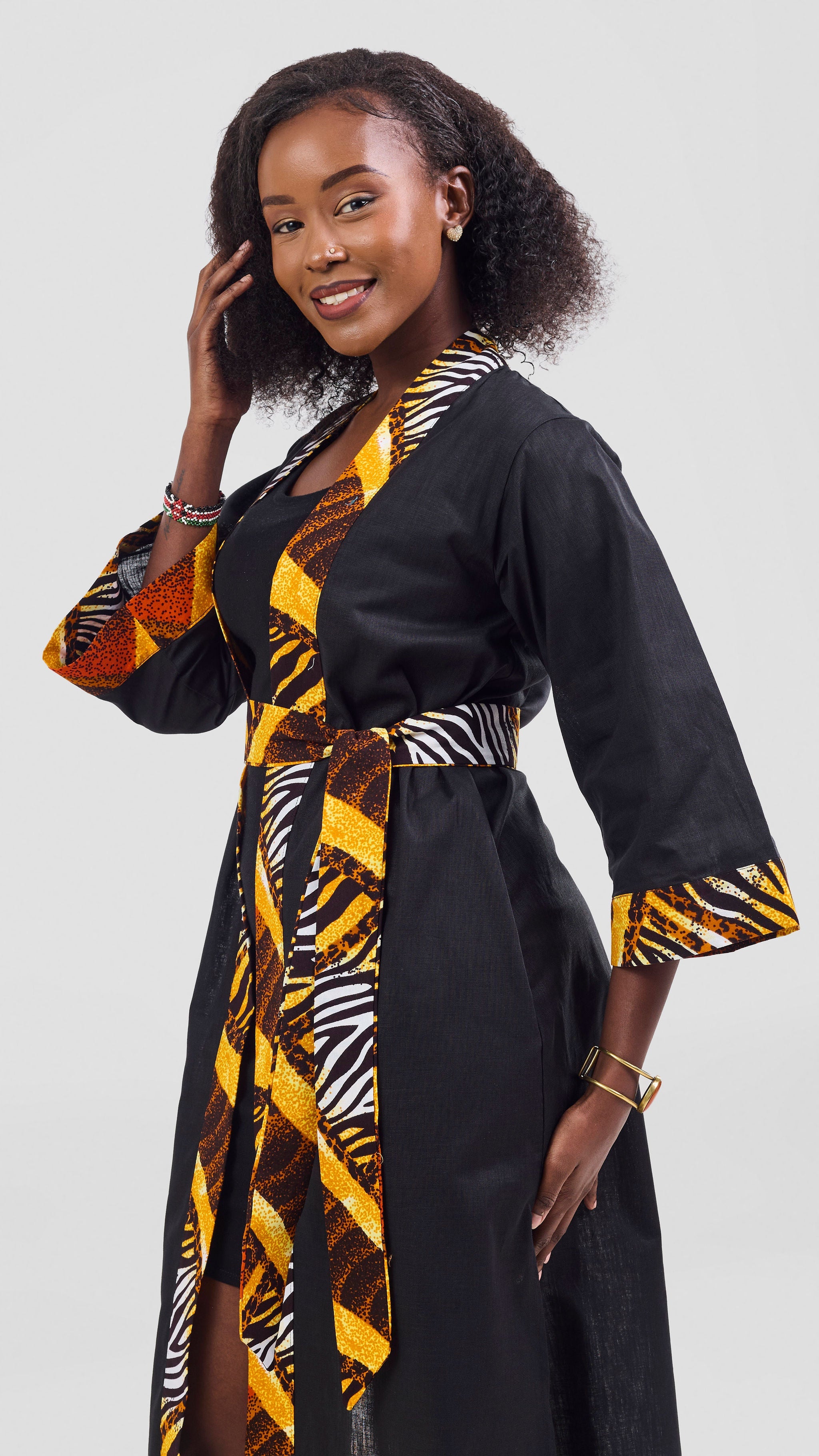 Discover timeless elegance with the Safari Tafari High Slit Kimono, a captivating blend of luxury and cultural expression. Woven from breathable linen and enriched with vibrant Ankara kitenge fabric, this piece features a sophisticated black palette punctuated by the mesmerizing Luena print. The dramatic high slit creates an alluring silhouette that moves with you, offering both comfort and undeniable style. Layer it effortlessly over dresses, jumpsuits, or swimwear, or wear it as a standalone statement. This versatile kimono transcends seasons and occasions, making it an indispensable addition to any fashion-forward closet. Invest in quality craftsmanship that celebrates African artistry while delivering the polish and confidence you deserve.