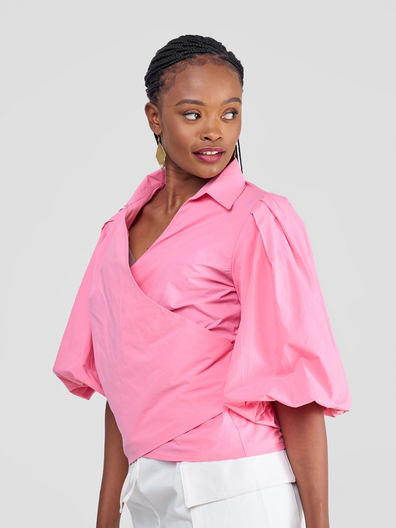 - Style: V-neck, collar, tie detail, gathered puff sleeves
