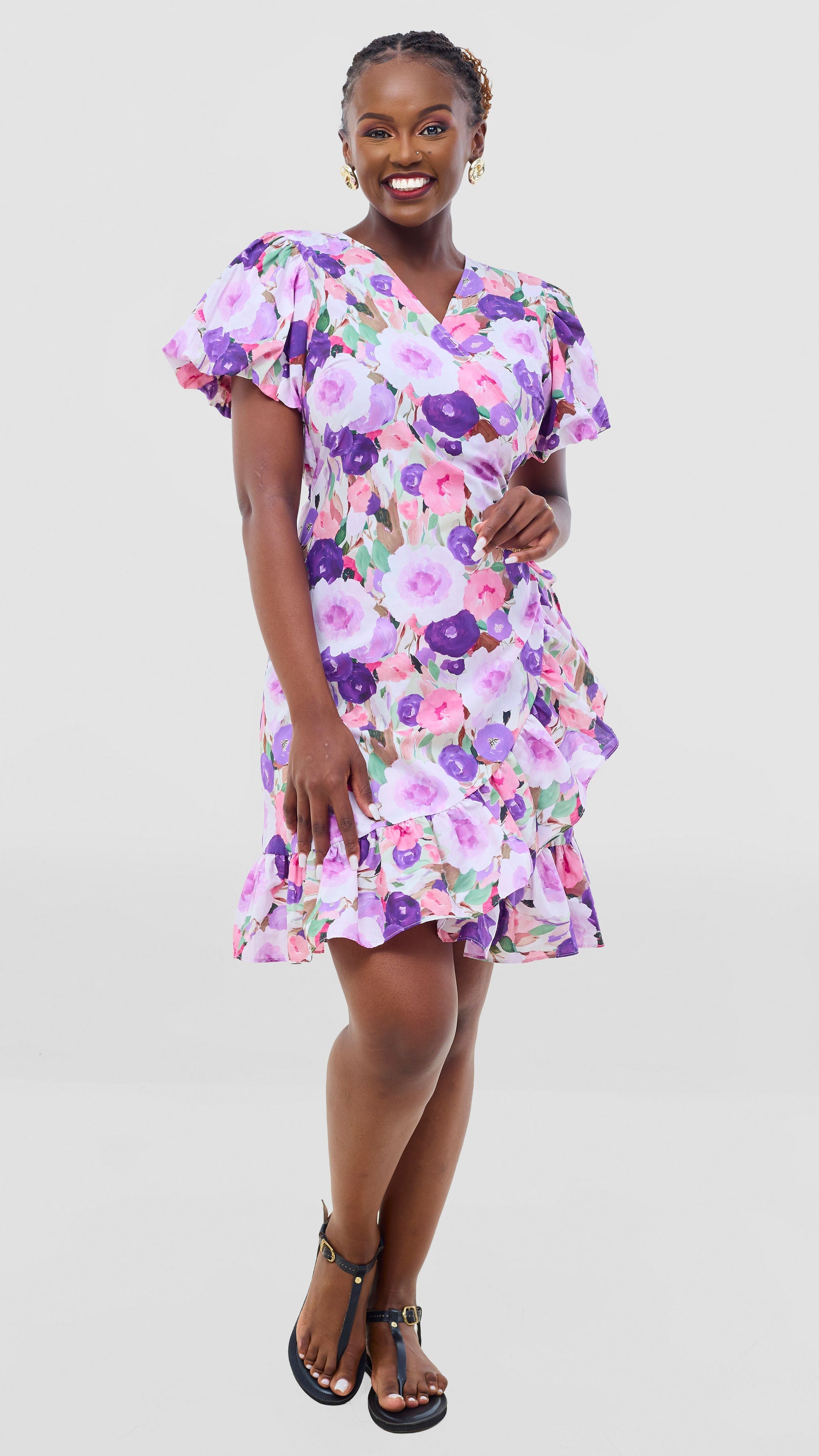 Embrace relaxed sophistication with this cotton wrap dress that adapts to your lifestyle. Constructed from soft, breathable cotton fabric, it offers all-day comfort without compromising on style. The knee-length cut paired with charming ruffles creates a feminine silhouette that feels both modern and timeless. The vibrant lilac and brown print brings warmth and personality to your wardrobe. Dress it down with casual sandals for weekend errands, or elevate it with heels for evening plans. This is the one piece that bridges your casual and dressy moments, delivering effortless elegance whenever you need it.