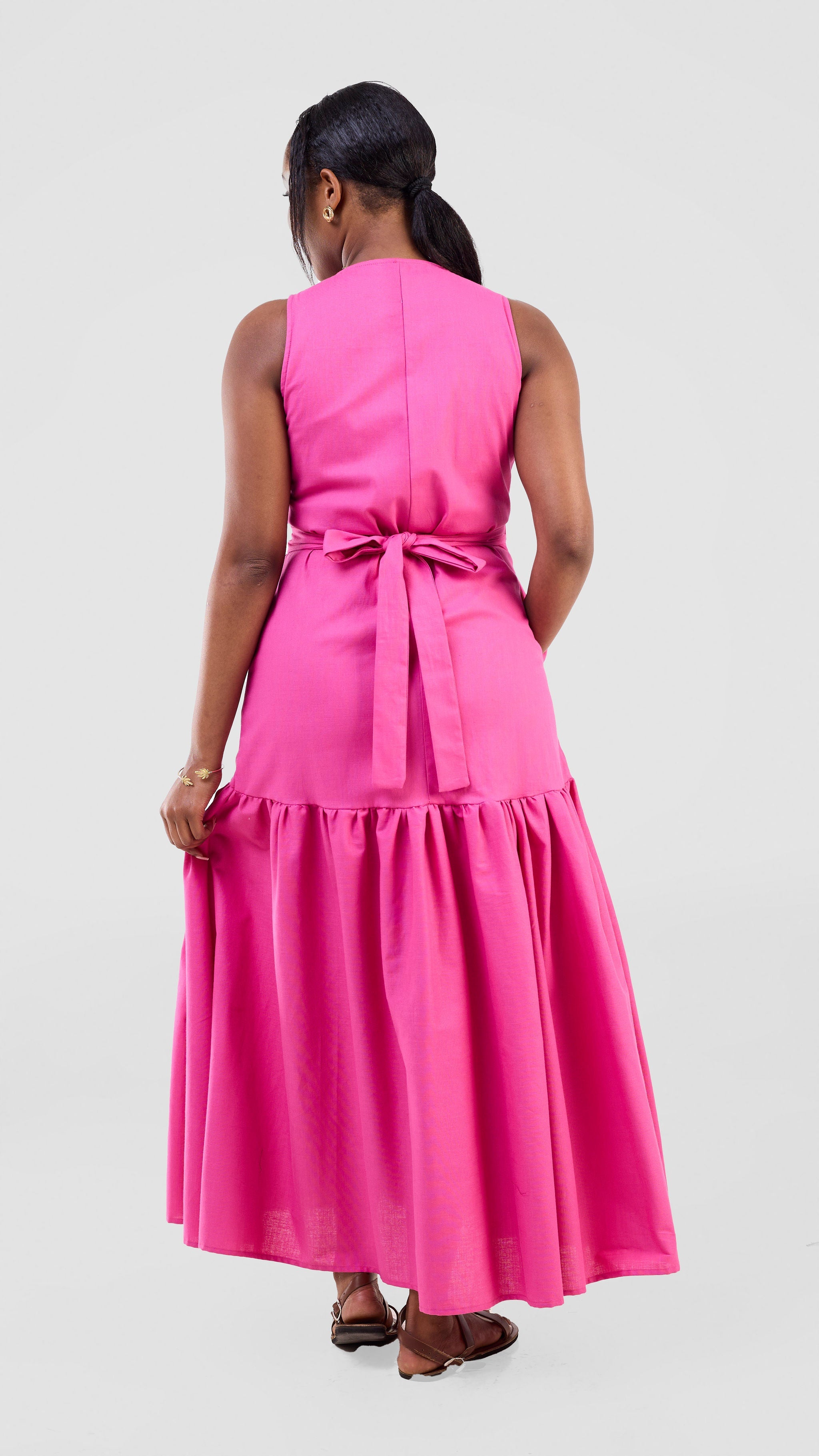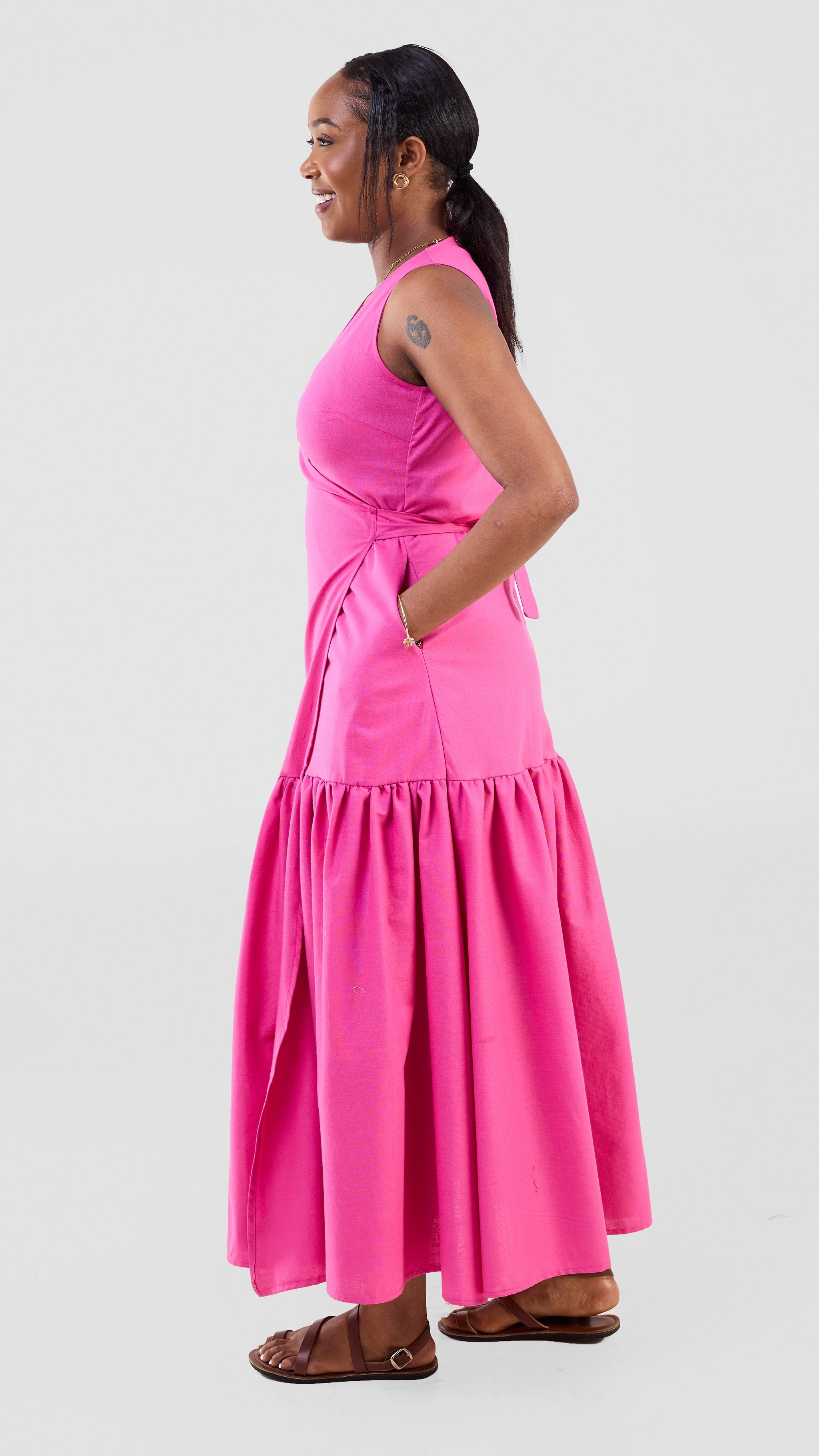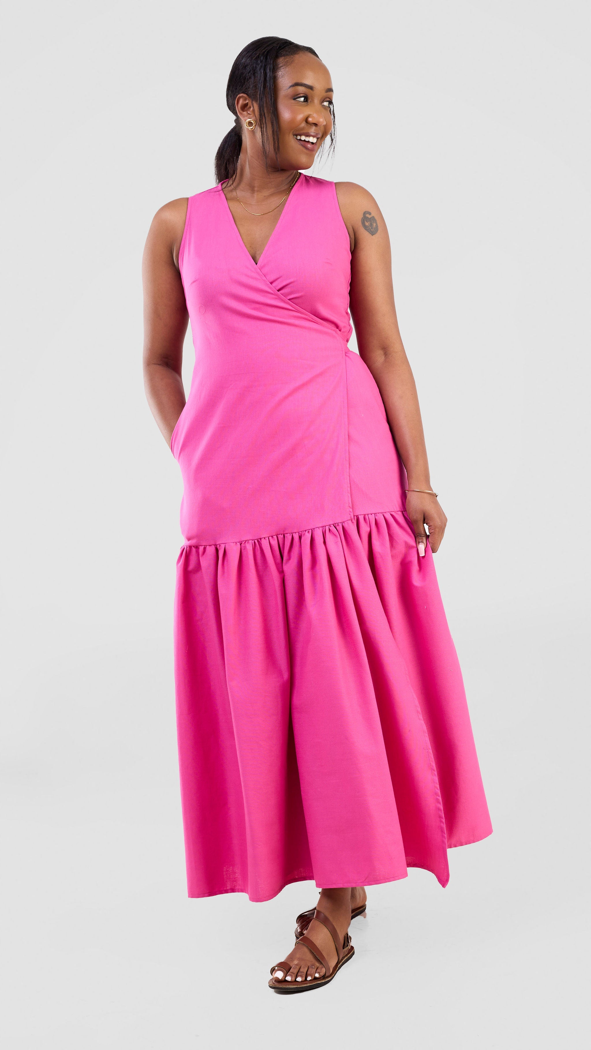 The Safari Naledi Gathered Panel Wrap Dress in pink offers a flattering silhouette with its gathered panels and adjustable wrap style. Designed for comfort and ease, it supports your confidence whether you're heading to a meeting or a casual outing. Its versatile design ensures you look polished while feeling comfortable all day long.