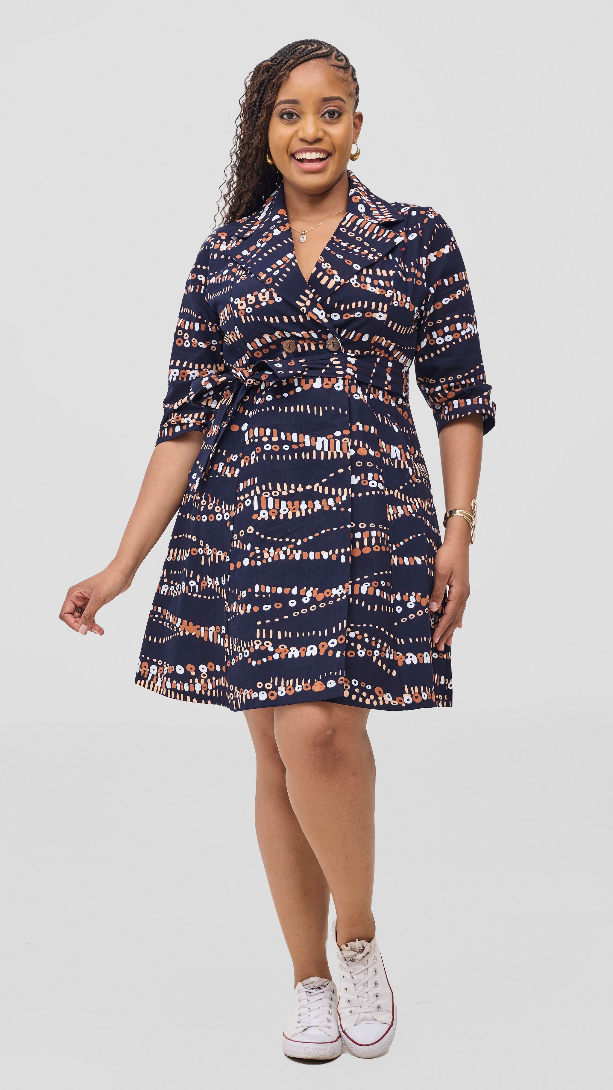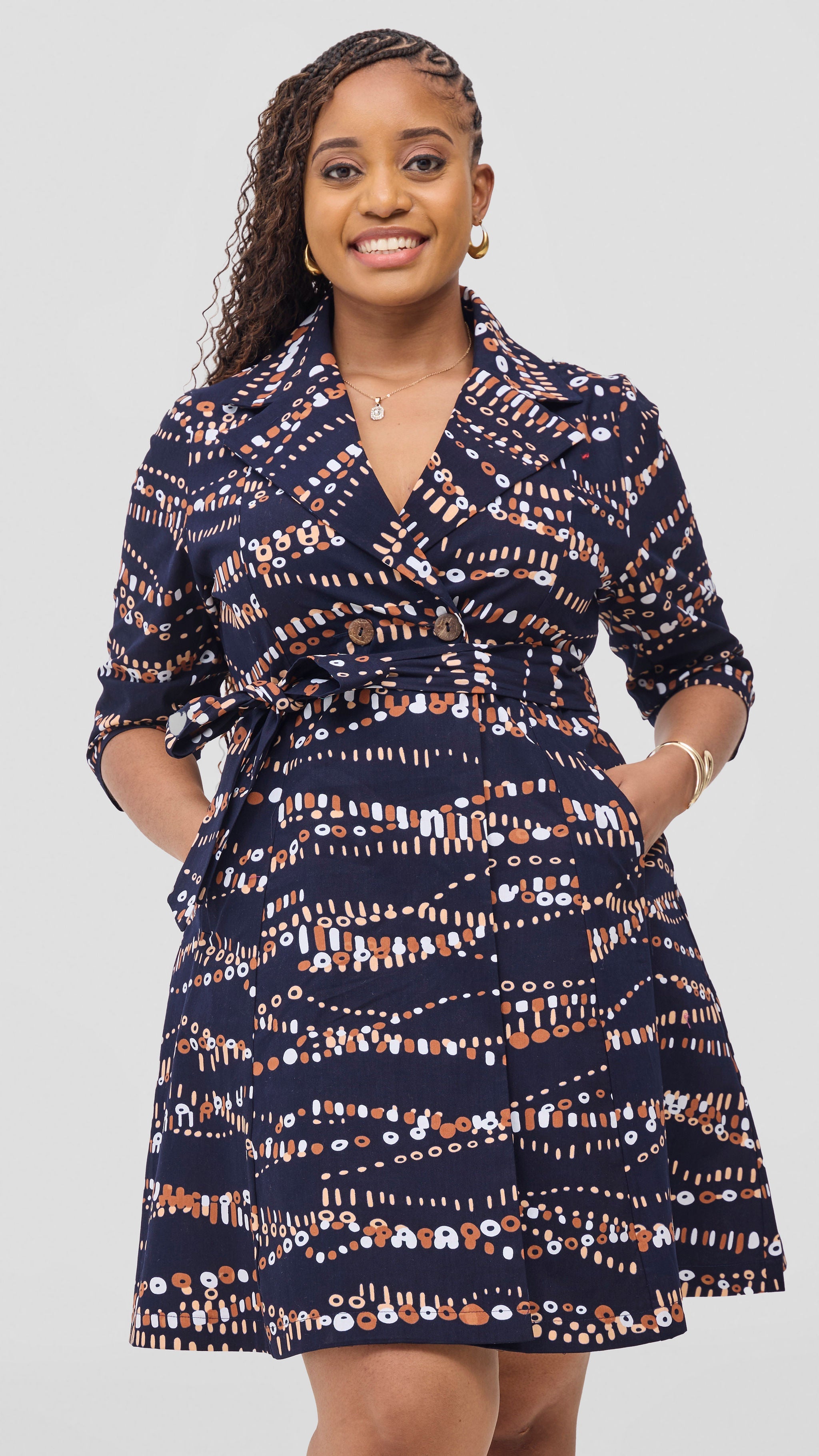 Embrace elegance and comfort with the Safari Nazari Coat Dress in Navy and Brown Chiku Print. This stylish piece combines a graceful coat dress silhouette with vibrant Bakari patterns, perfect for making a confident statement. Its flattering design offers ease of movement while adding a splash of color to your wardrobe. Ideal for both casual outings and special occasions, this dress supports your unique style with thoughtful detail and quality craftsmanship.