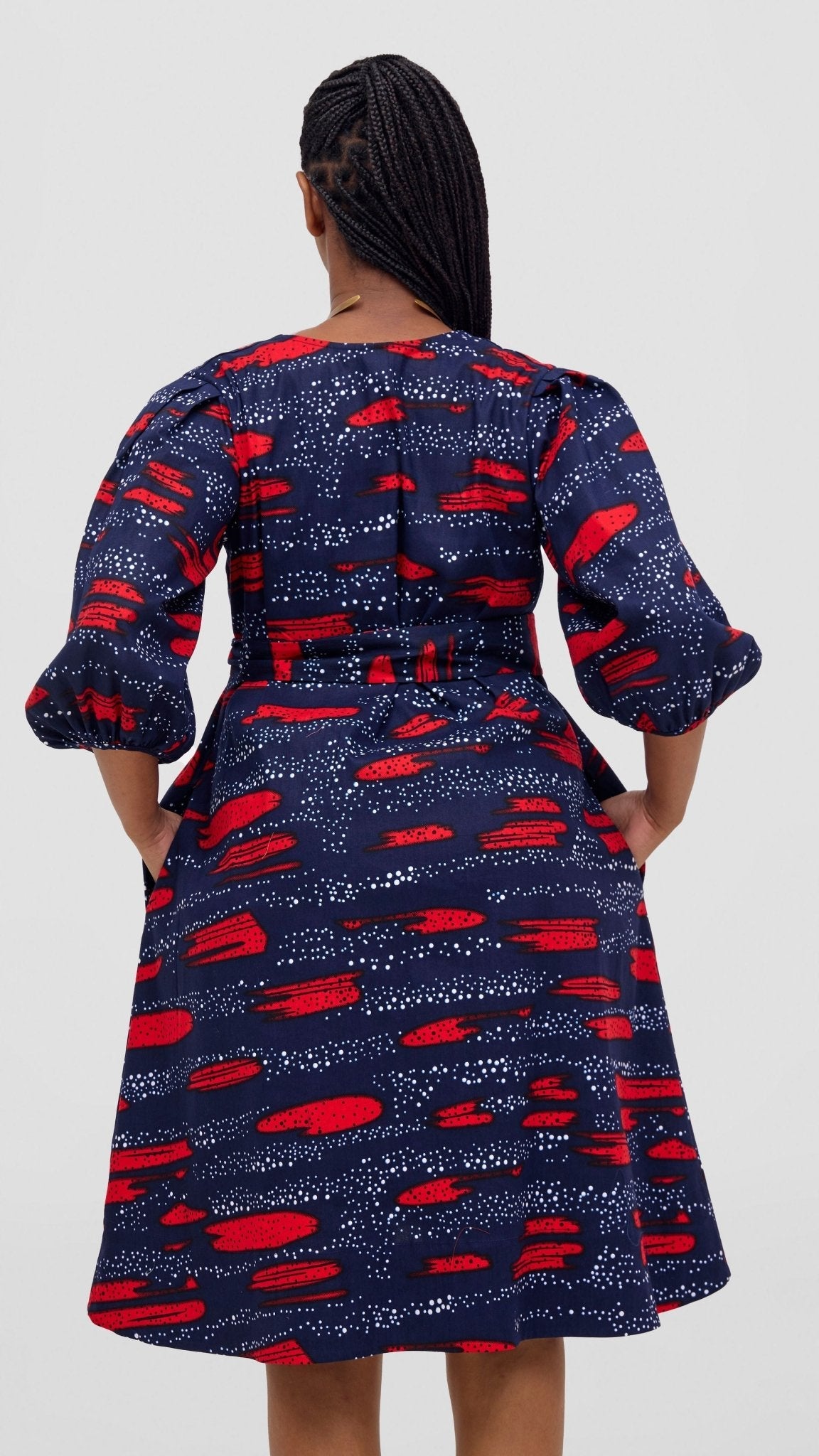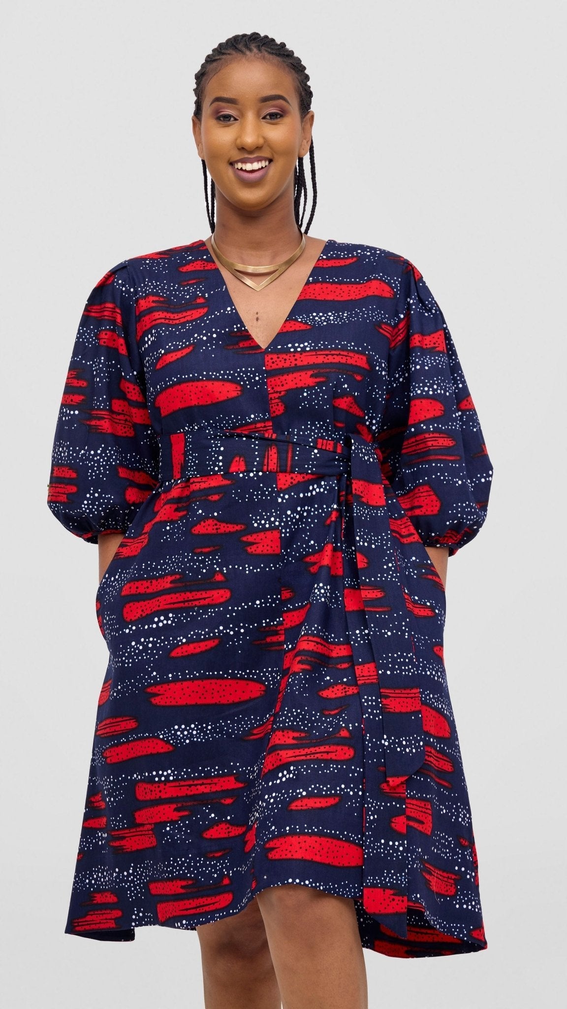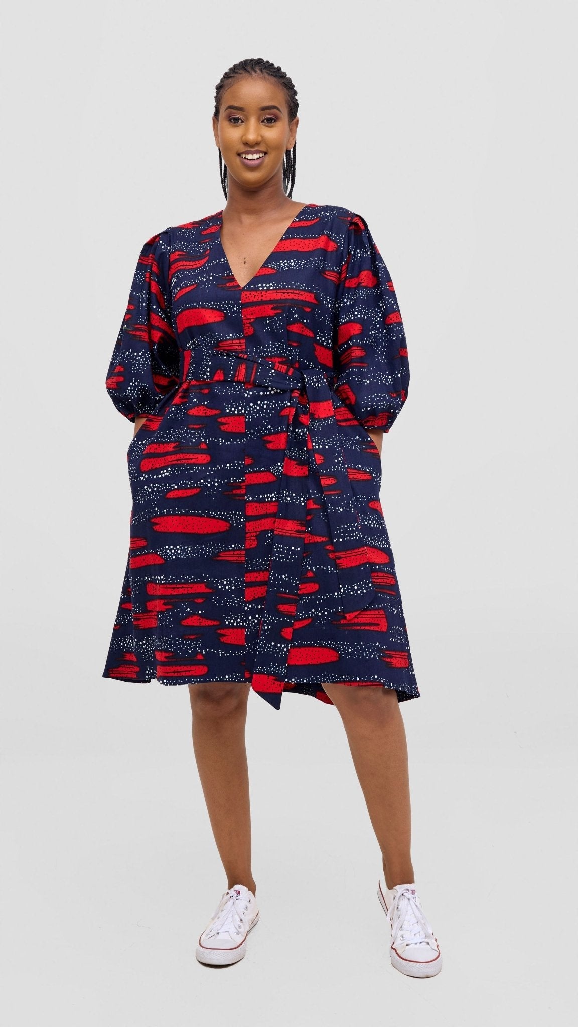 The Safari Tara Bishop Sleeve Dress in Navy with Red Maya Print combines elegant design with practical features. Crafted with bishop sleeves for a refined silhouette, this dress also includes convenient pockets, blending style and functionality. Its vibrant navy and red Maya print adds a distinctive, sophisticated touch suitable for various occasions.