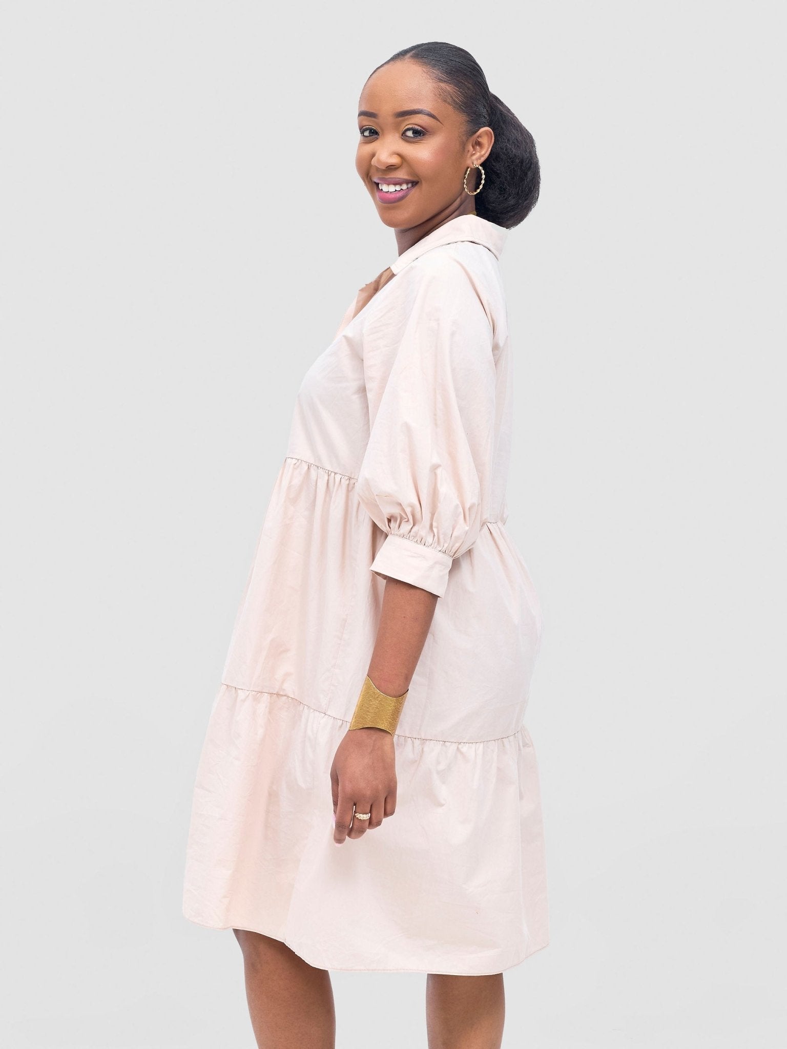 Safari by Vivo Tawi Shirt Collar Bishop Sleeve Tiered Dress - Khaki