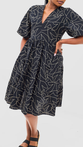 Safari Naledi Bishop Sleeve Tiered Dress - White / Black Wia Print