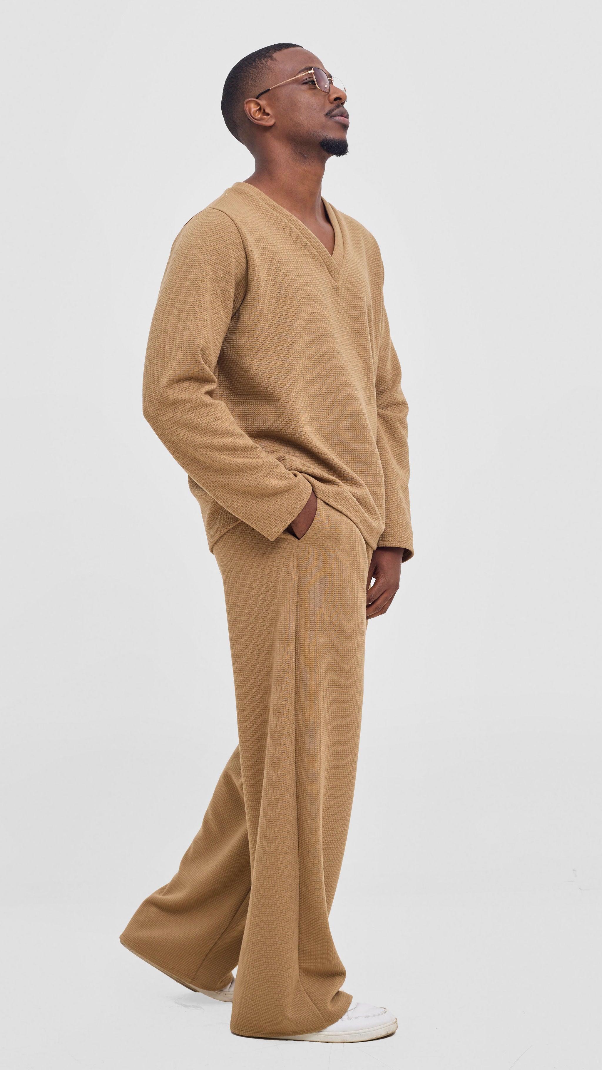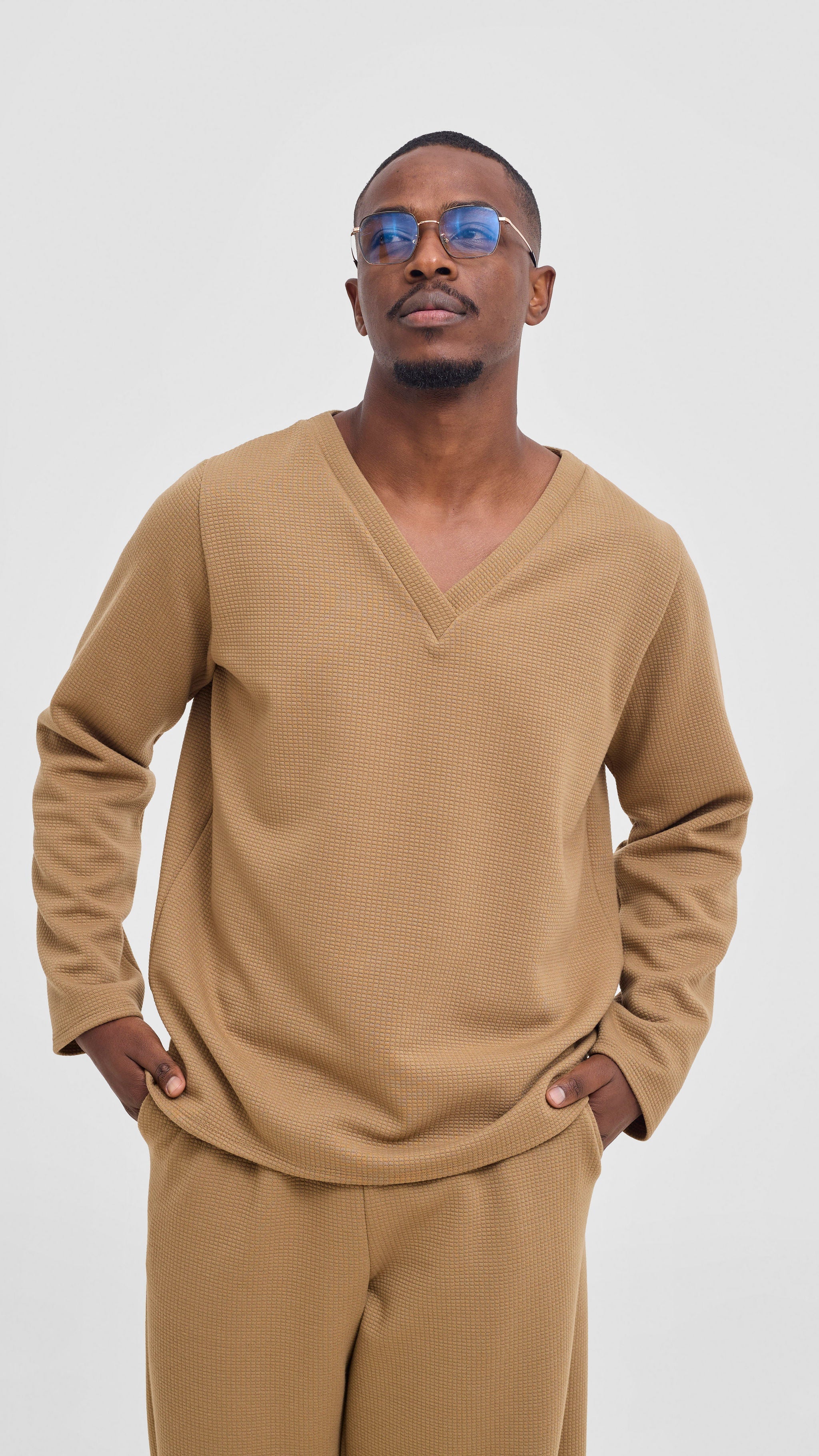 Step into bold comfort with the Shiv Shikie X Safari V-Neck Long Sleeve T-shirt in Dark Tan. This unisex piece breaks the mold—effortlessly easy to wear yet striking enough to command attention. Pair it with matching pants for a daring, coordinated look or wear it solo to flaunt your fearless style. Designed for those who refuse to blend in, this tee combines comfort with a luxe edge that challenges the ordinary. Make your statement without saying a word.