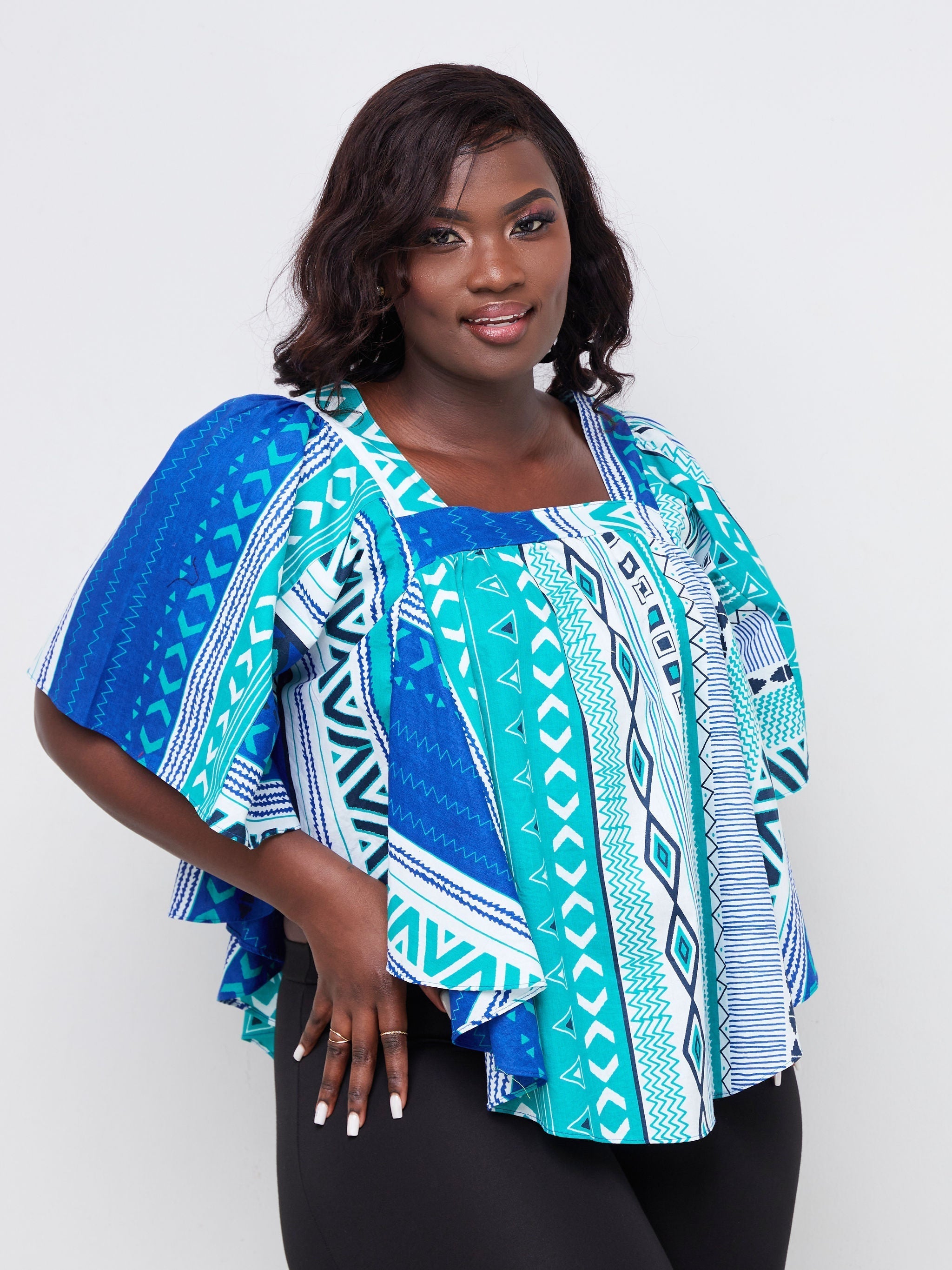 Safari Mara Cape Top - Sea Green / Blue Ankara Print