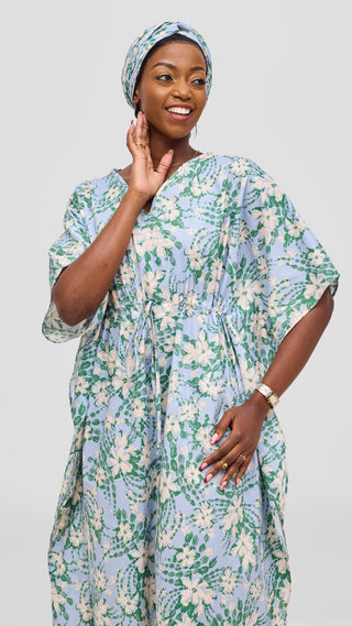 Safari by Vivo Cotton Wide Drawstring Kaftan - Light Blue / Green Print