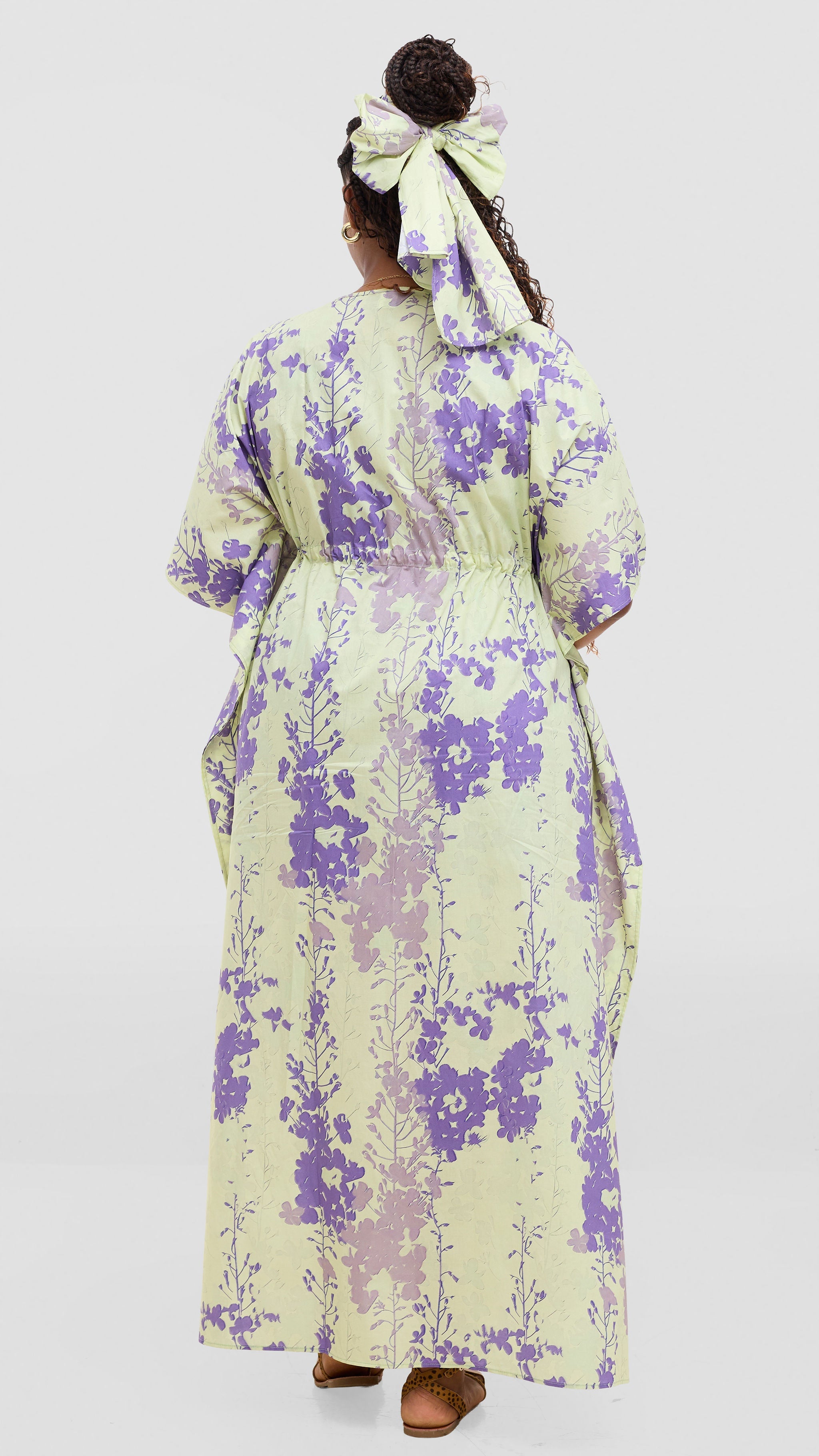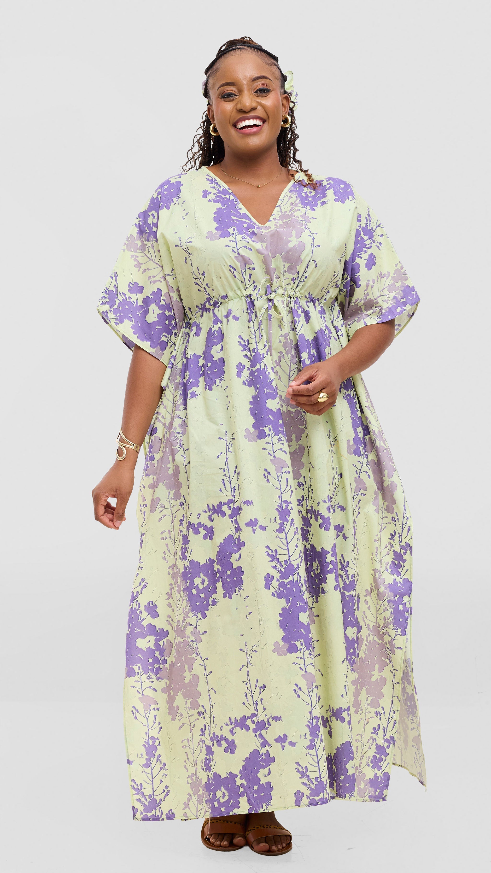 Safari by Vivo Cotton Wide Drawstring Kaftan - Light Olive / Purple Print