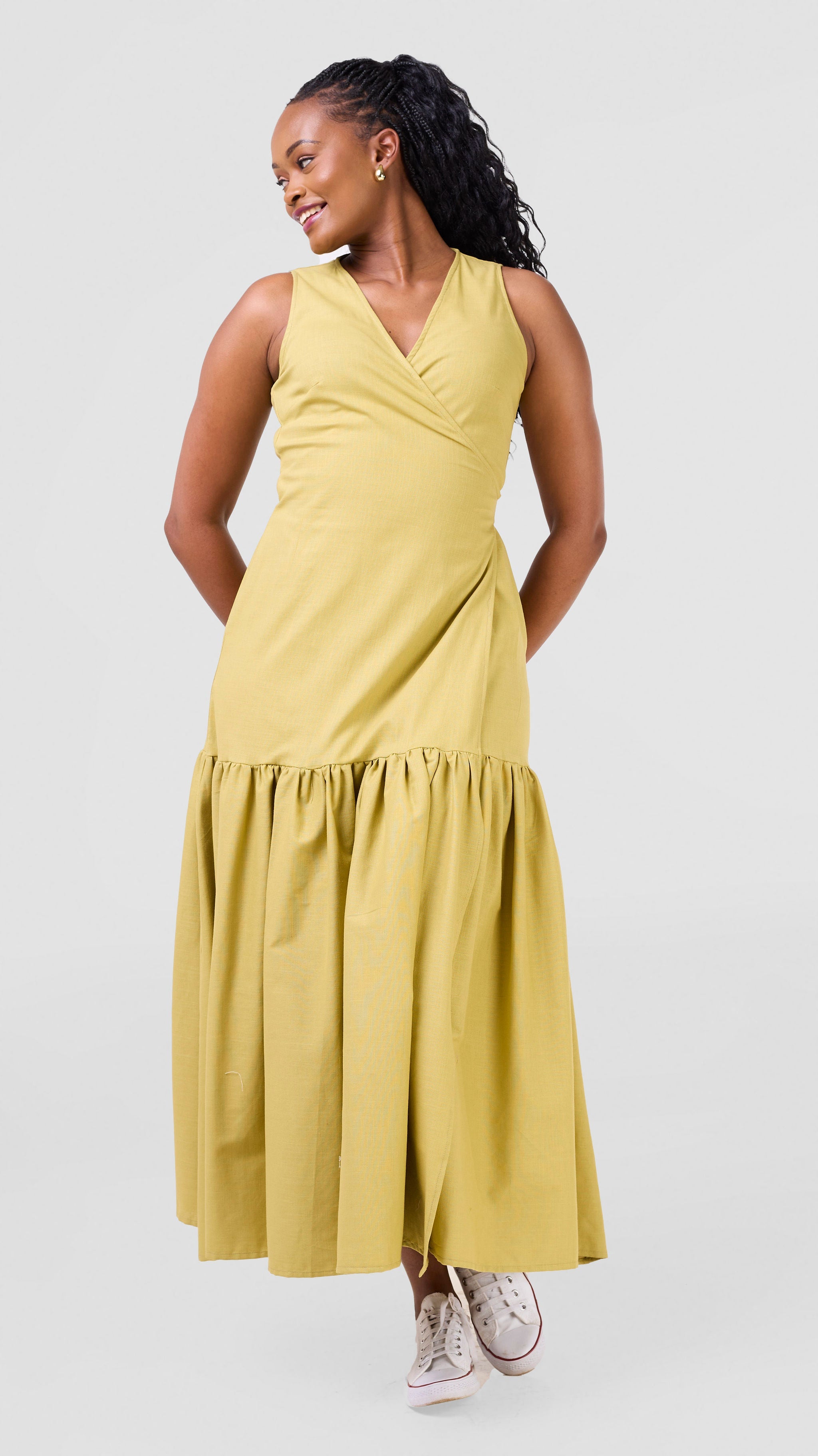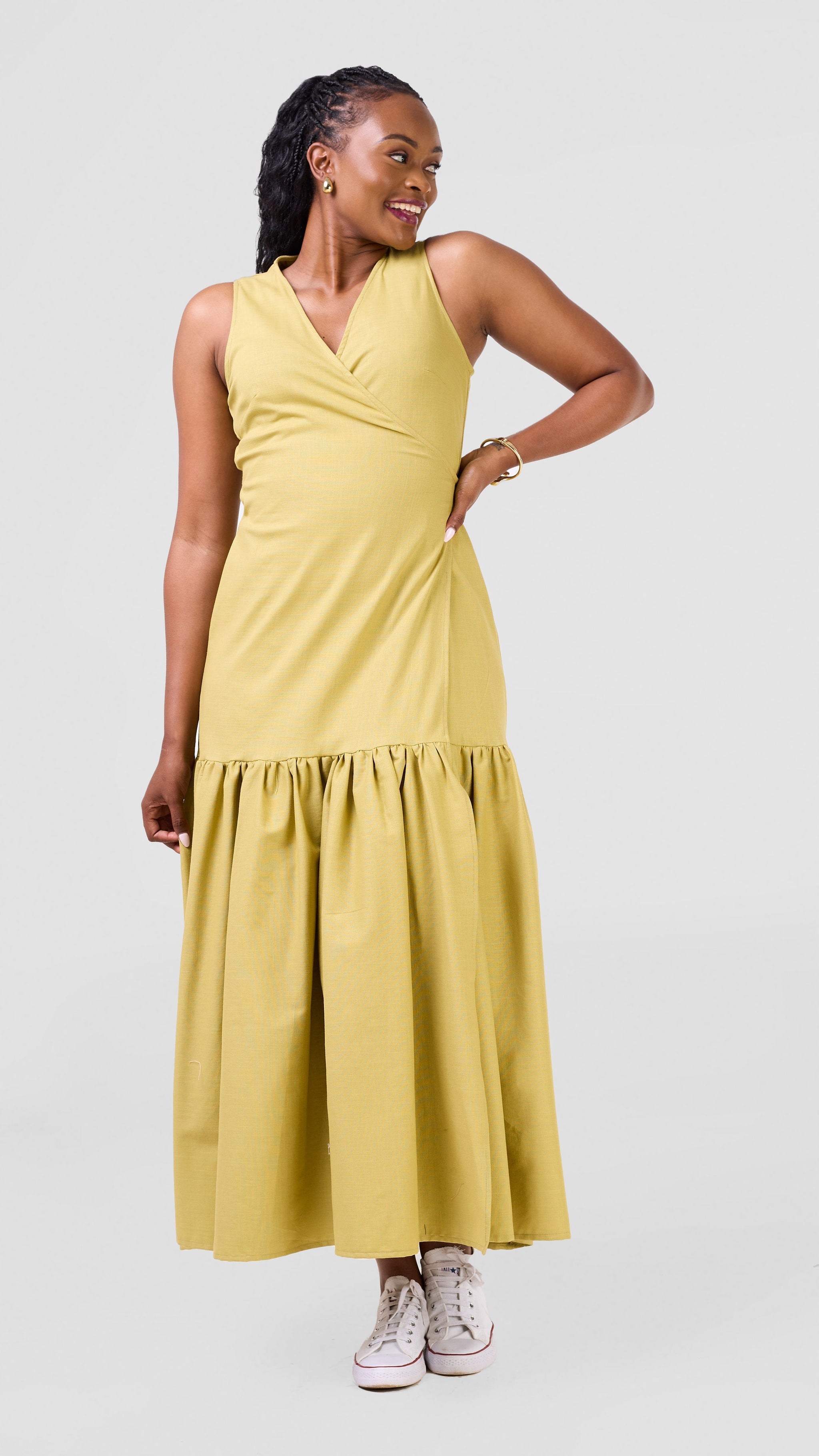 The Safari Naledi Gathered Panel Wrap Dress in olive offers a flattering silhouette with its gathered panels and adjustable wrap style. Designed for comfort and ease, it supports your confidence whether you're heading to a meeting or a casual outing. Its versatile design ensures you look polished while feeling comfortable all day long.