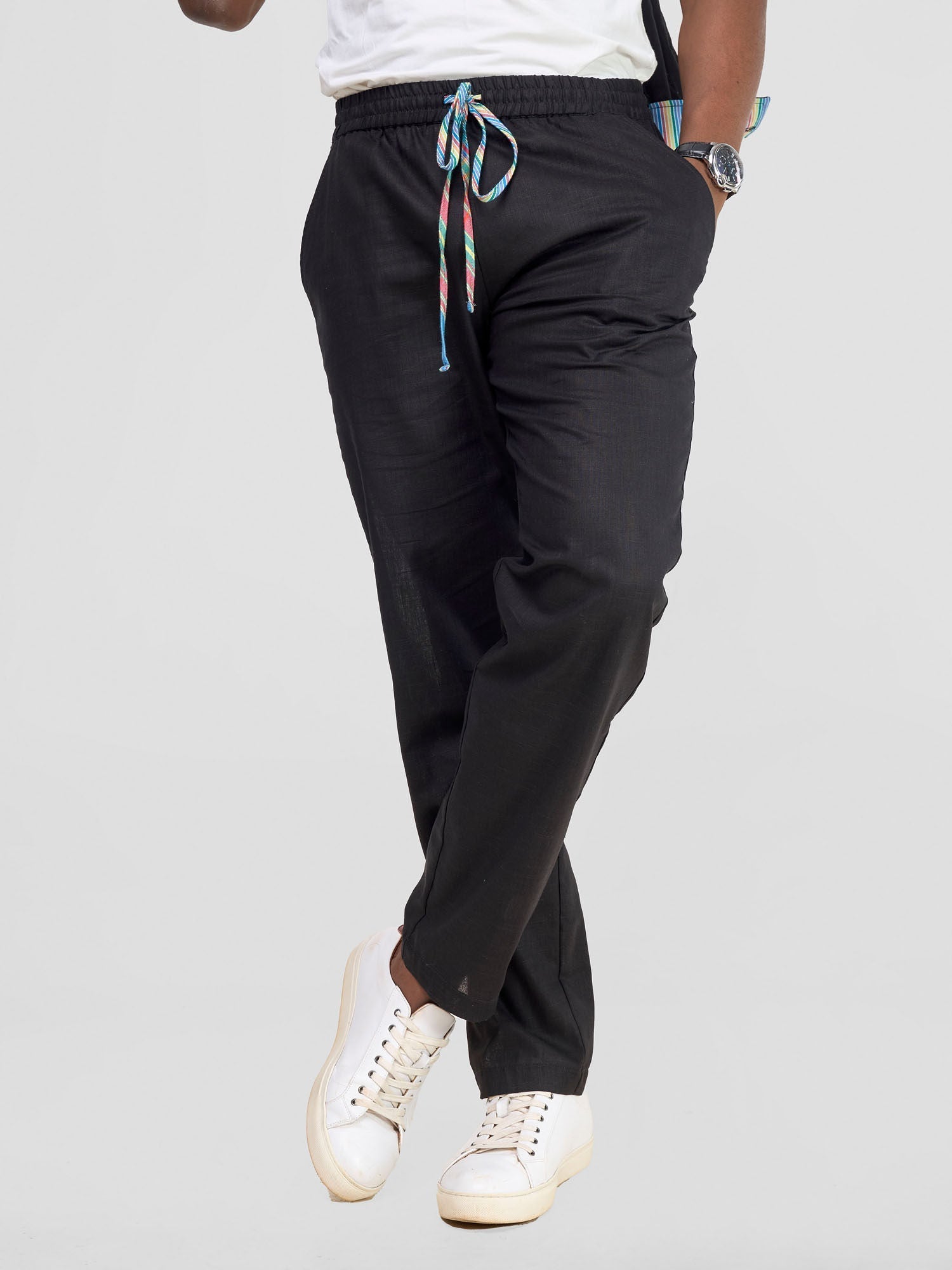 • These plain men's pants feature eye-catching multicolored drawstrings, adding a pop of color and a casual, stylish vibe to the design