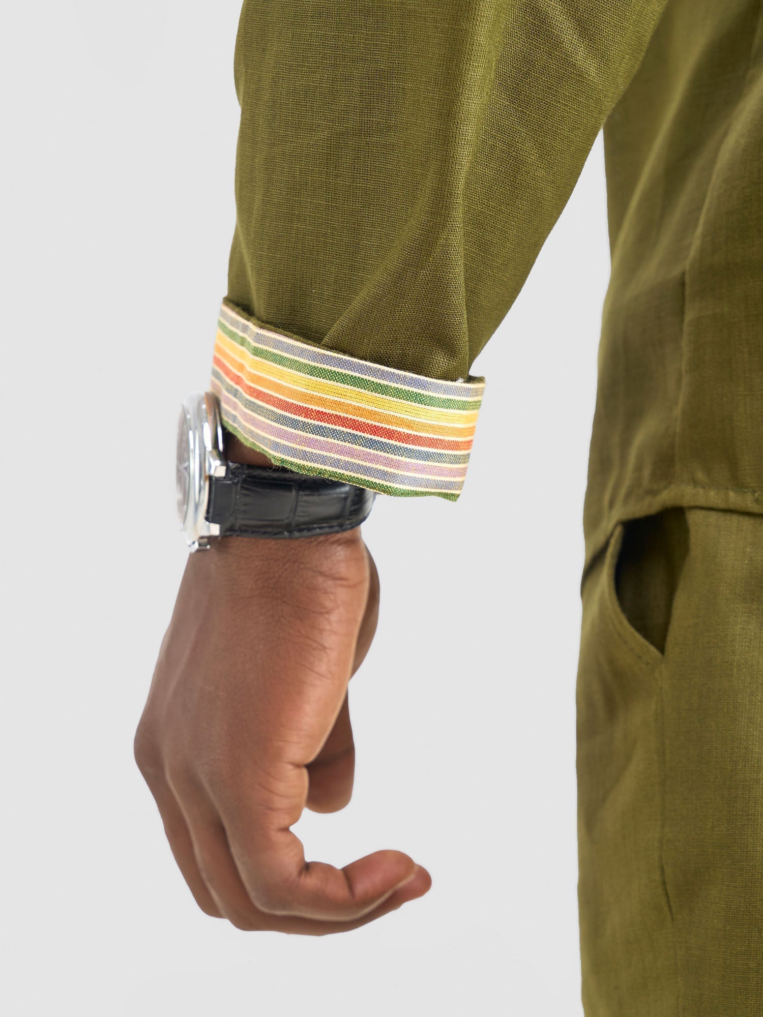 • This half-placket shirt features a minimalist design with a plain Mandarin collar, complemented by vibrant multicolored cuffs for a subtle yet stylish contrast