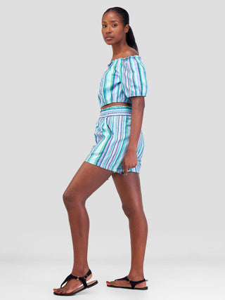 Safari Kikoy Off Shoulder Crop Top - Blue / Pink Print