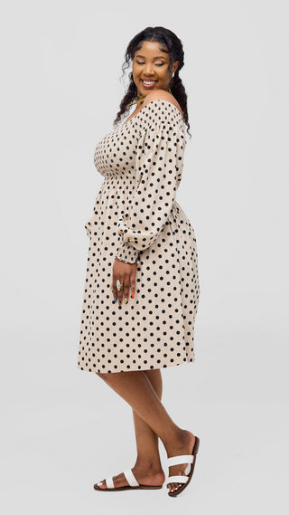 Safari Nazari Off Shoulder Dress - Beige / Black Polka Print