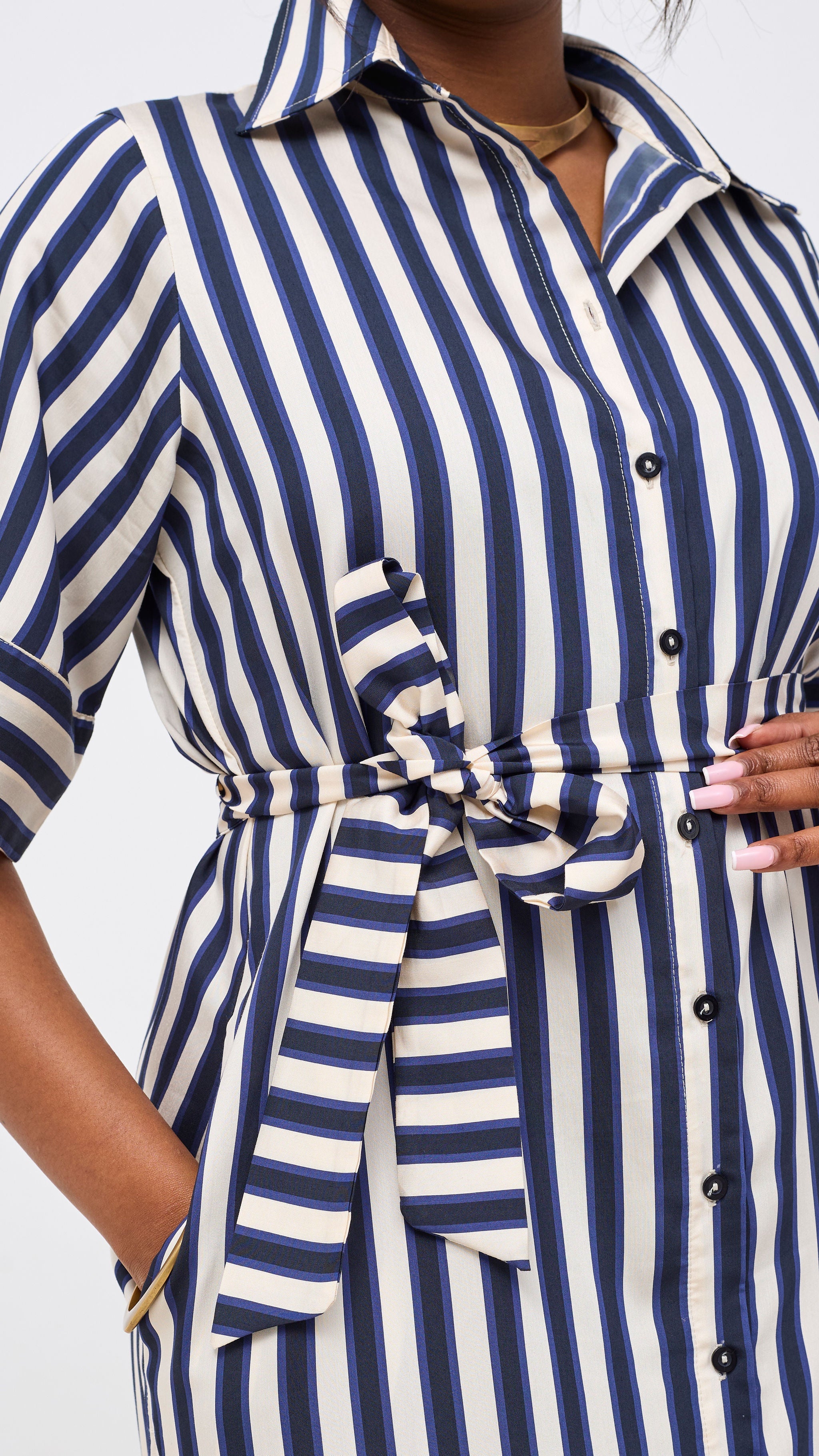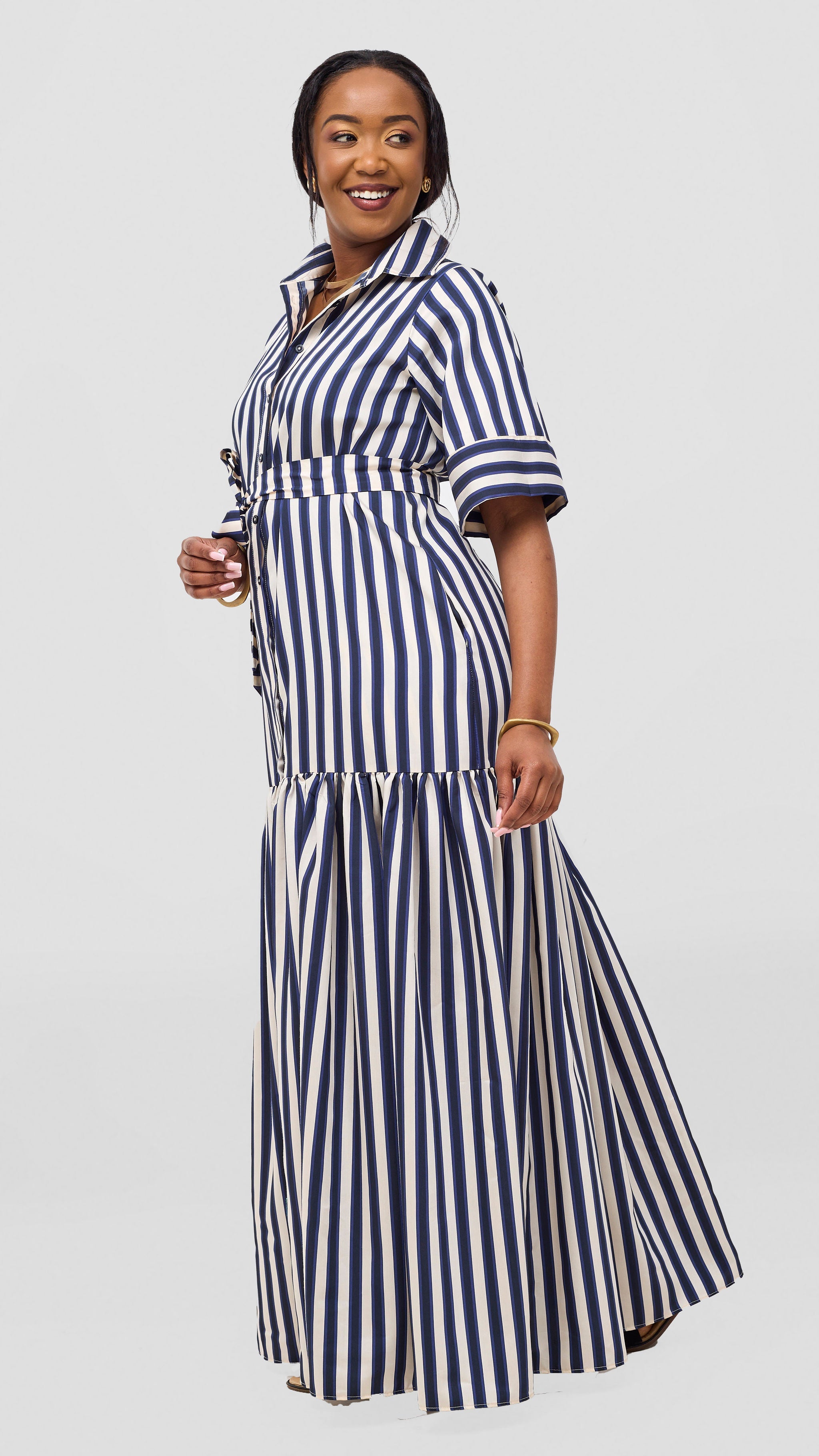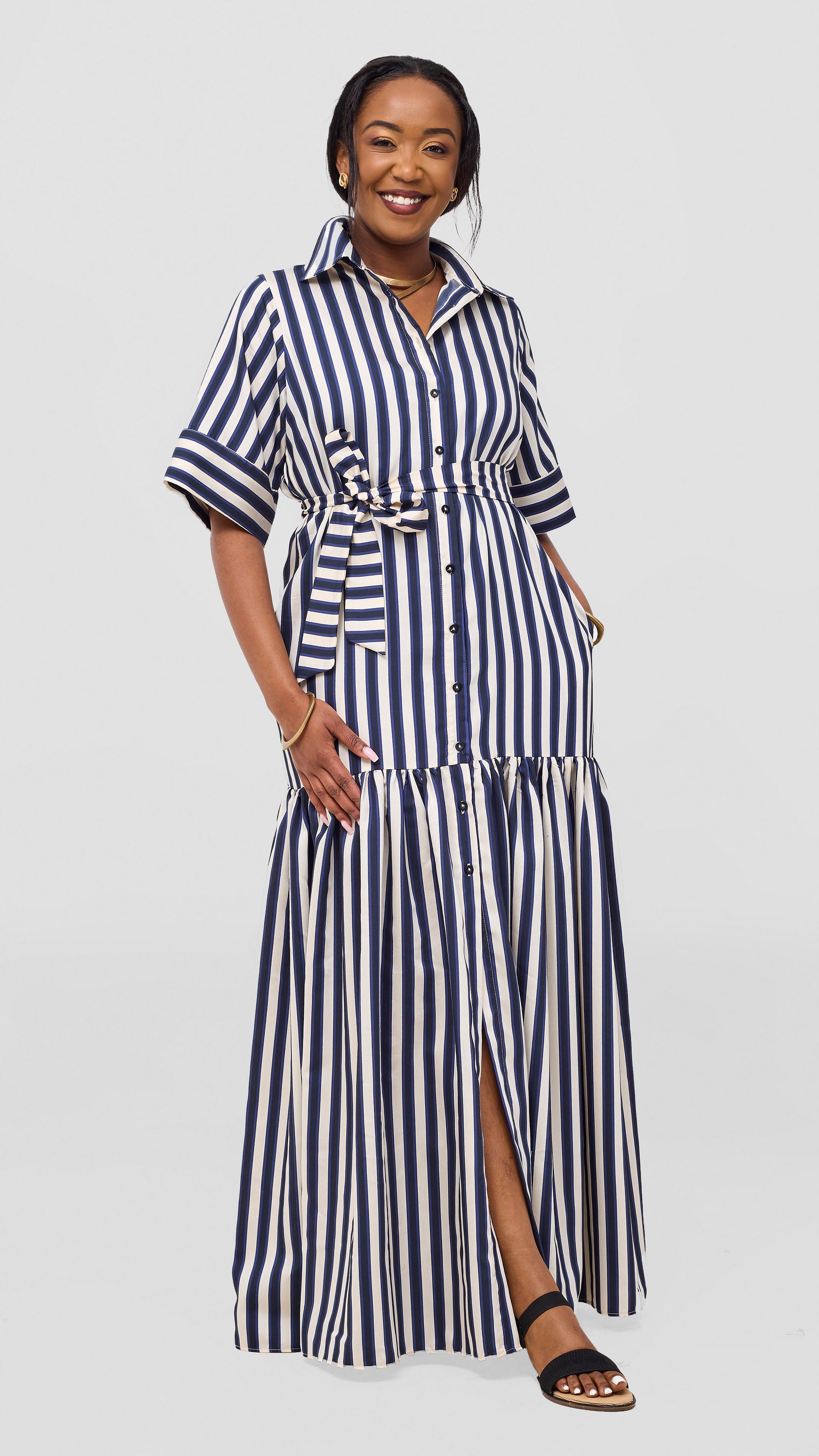 Refresh your collection with the Safari Nazari Maxi Shirt Dress featuring Navy and cream stripes. Expertly designed, this dress merges traditional shirt elements with a graceful maxi cut, delivering refined elegance. Its understated stripe design adds a classic touch, ideal for casual daytime wear or sophisticated evening affairs. Built for both comfort and style, it effortlessly adapts to various settings while exuding polished confidence..