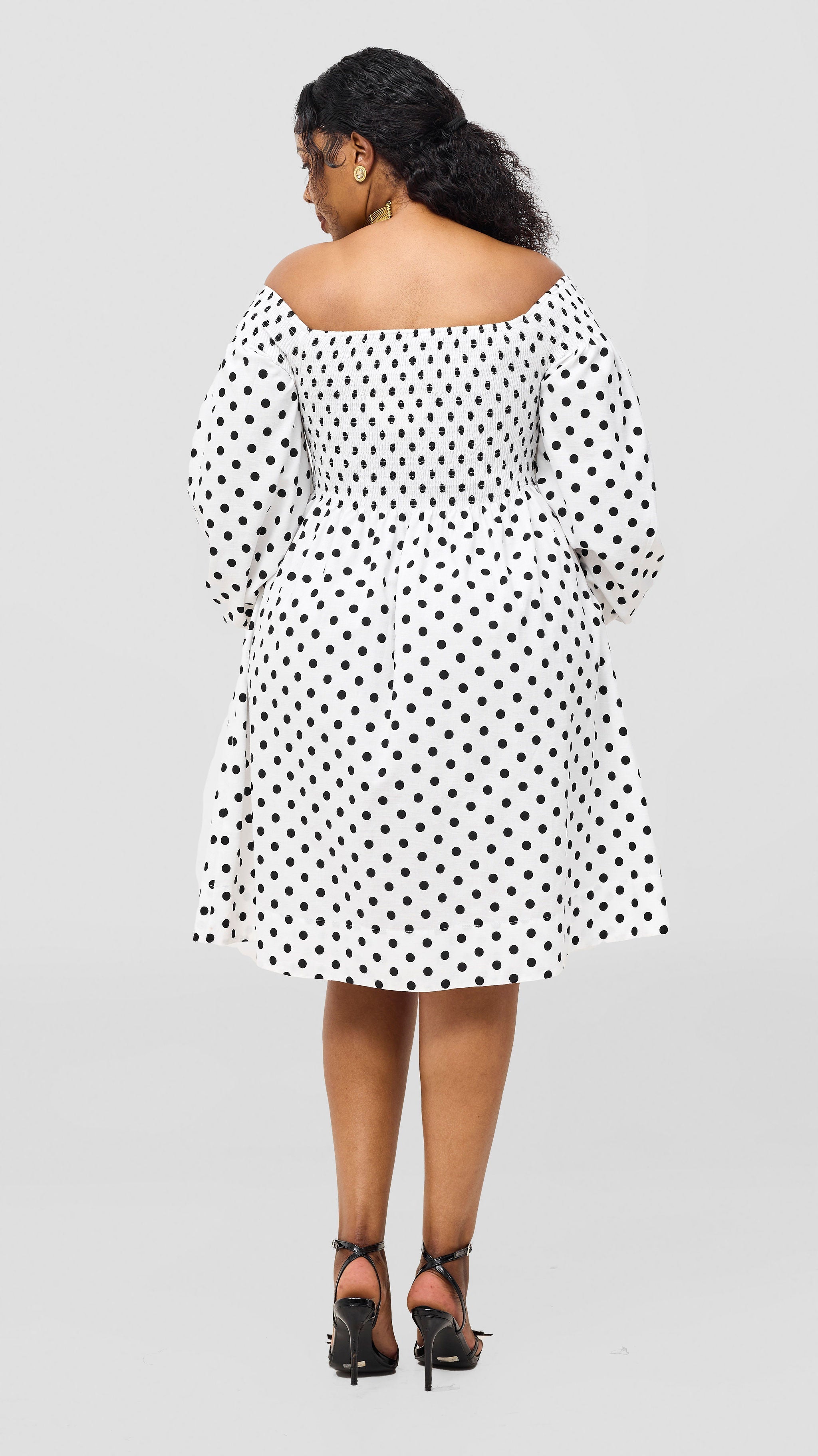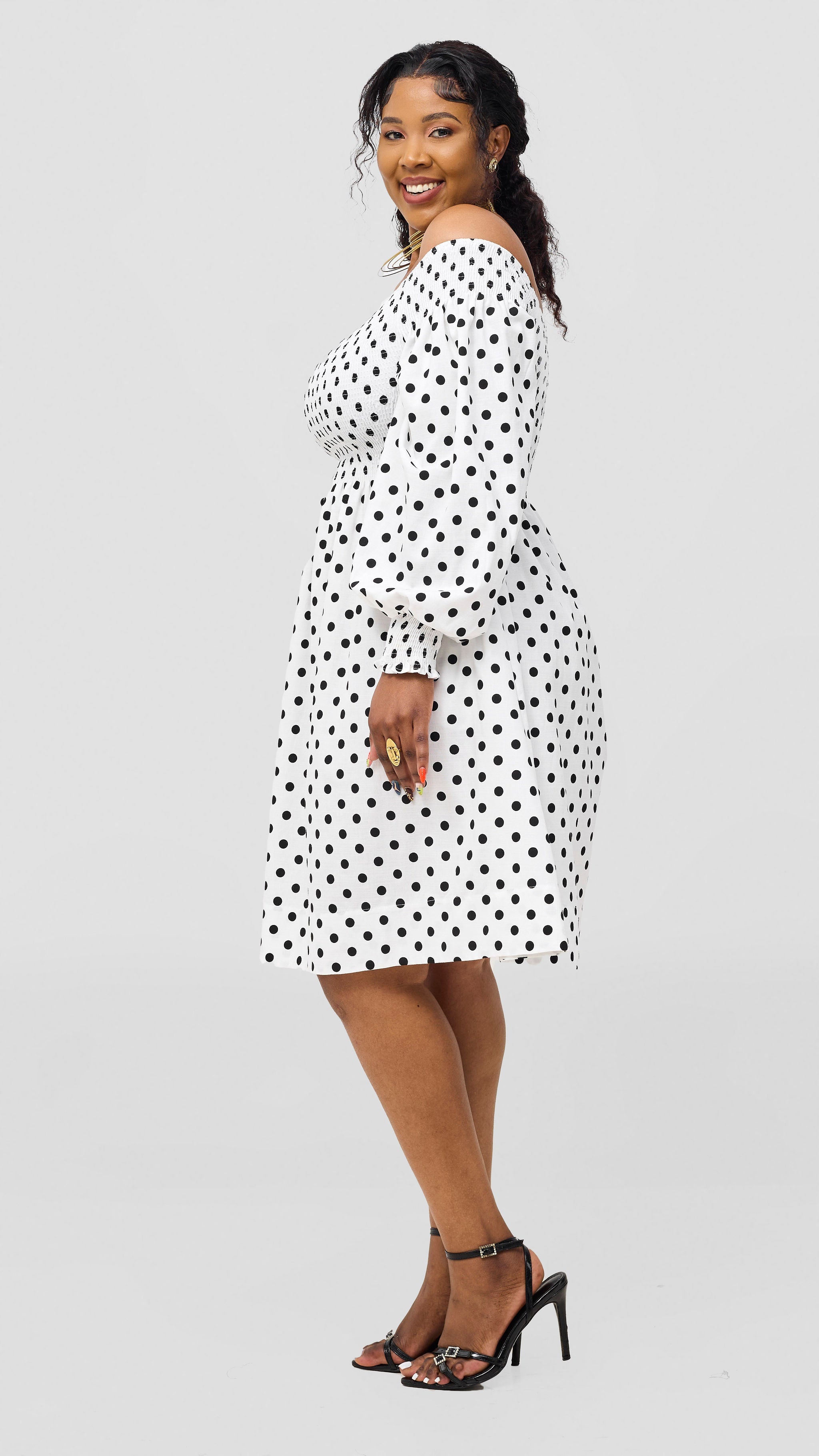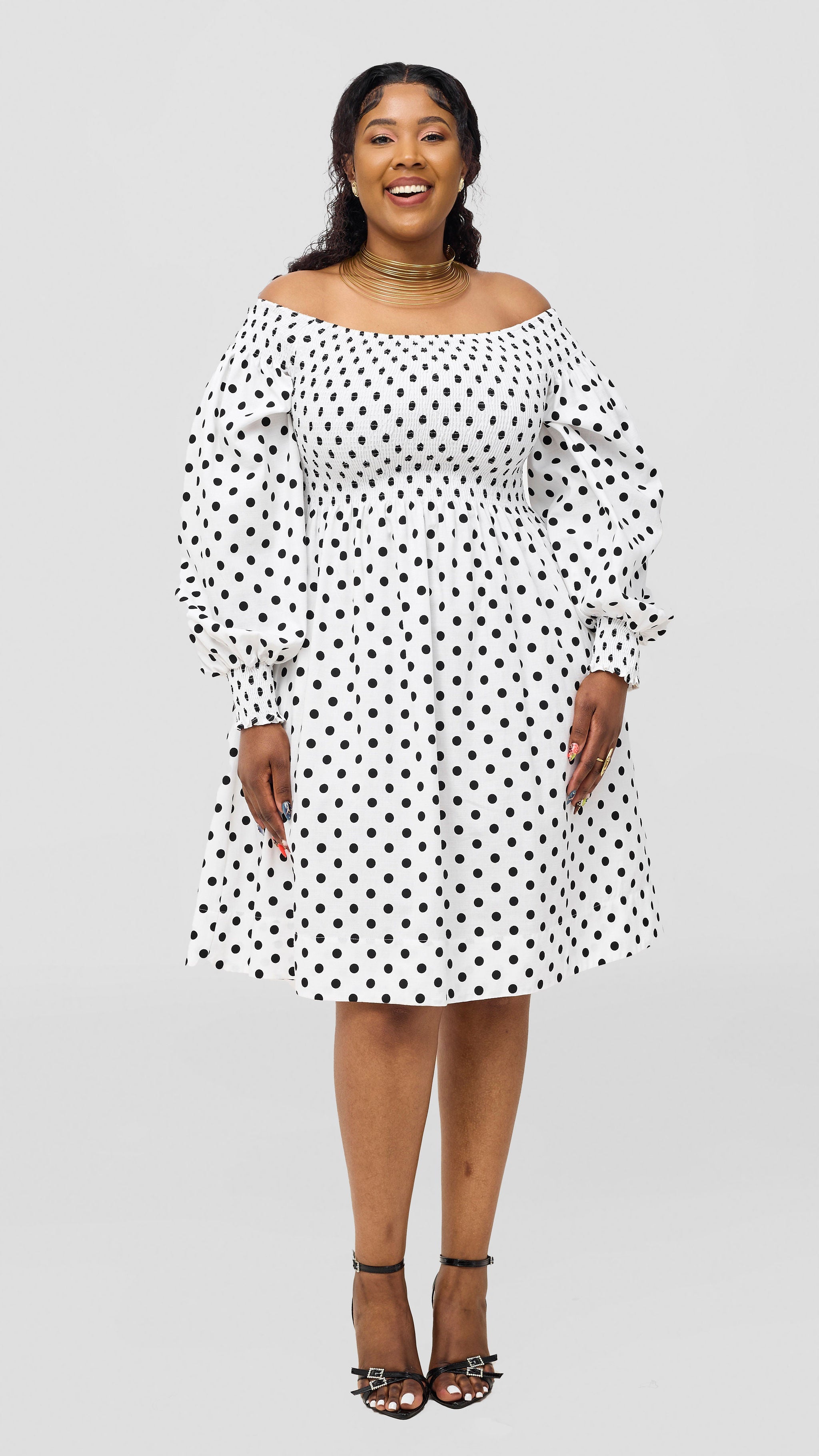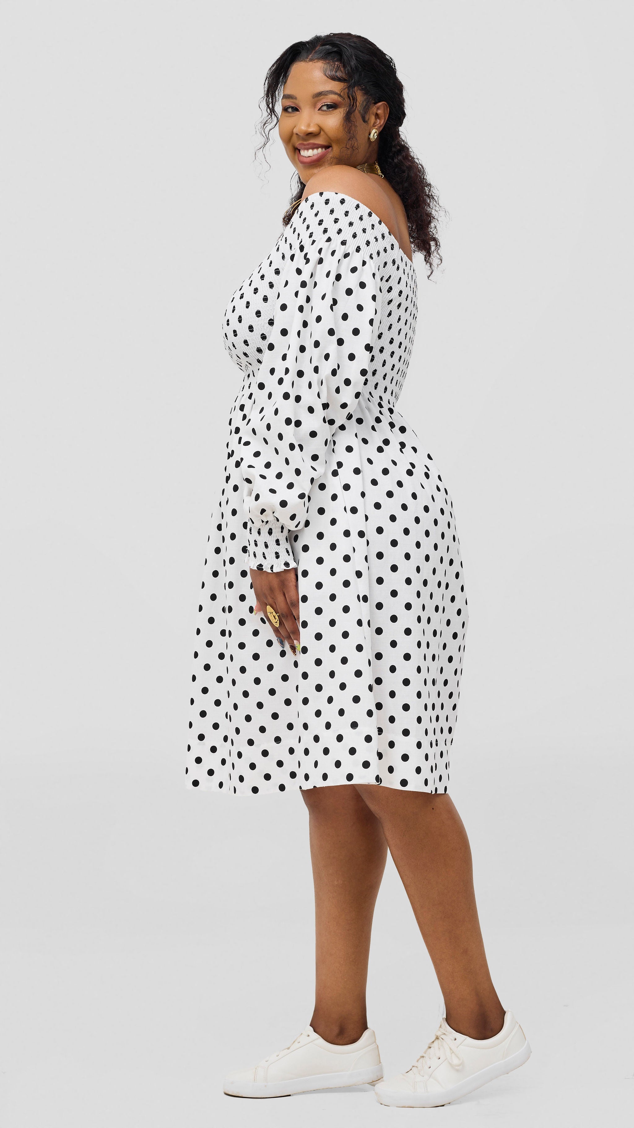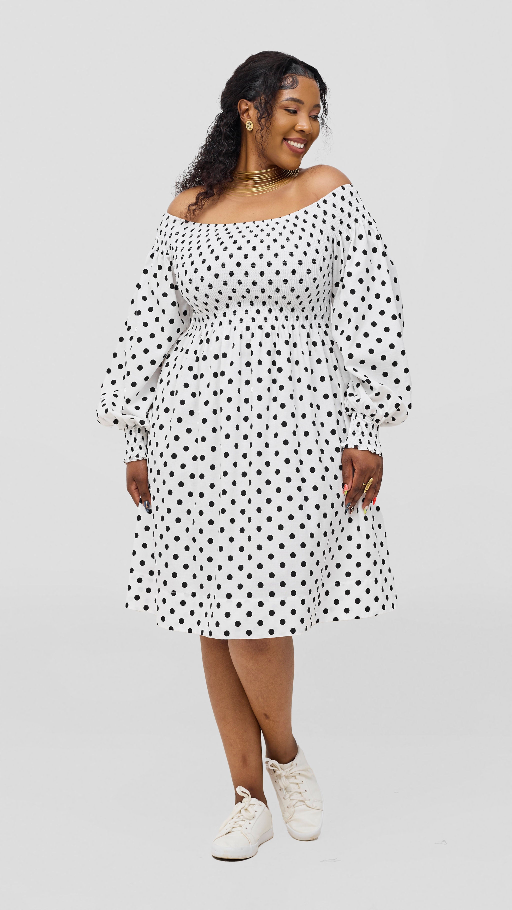Bring effortless style to your wardrobe with the Safari Nazari Off Shoulder Dress in White with black polka dots. Its versatile design lets you dress it up for elegant occasions or keep it casual for everyday wear. The off-shoulder cut adds a touch of femininity, while the playful print keeps your look fresh and lively. Perfect for any event, this dress combines comfort and charm in one flattering piece.