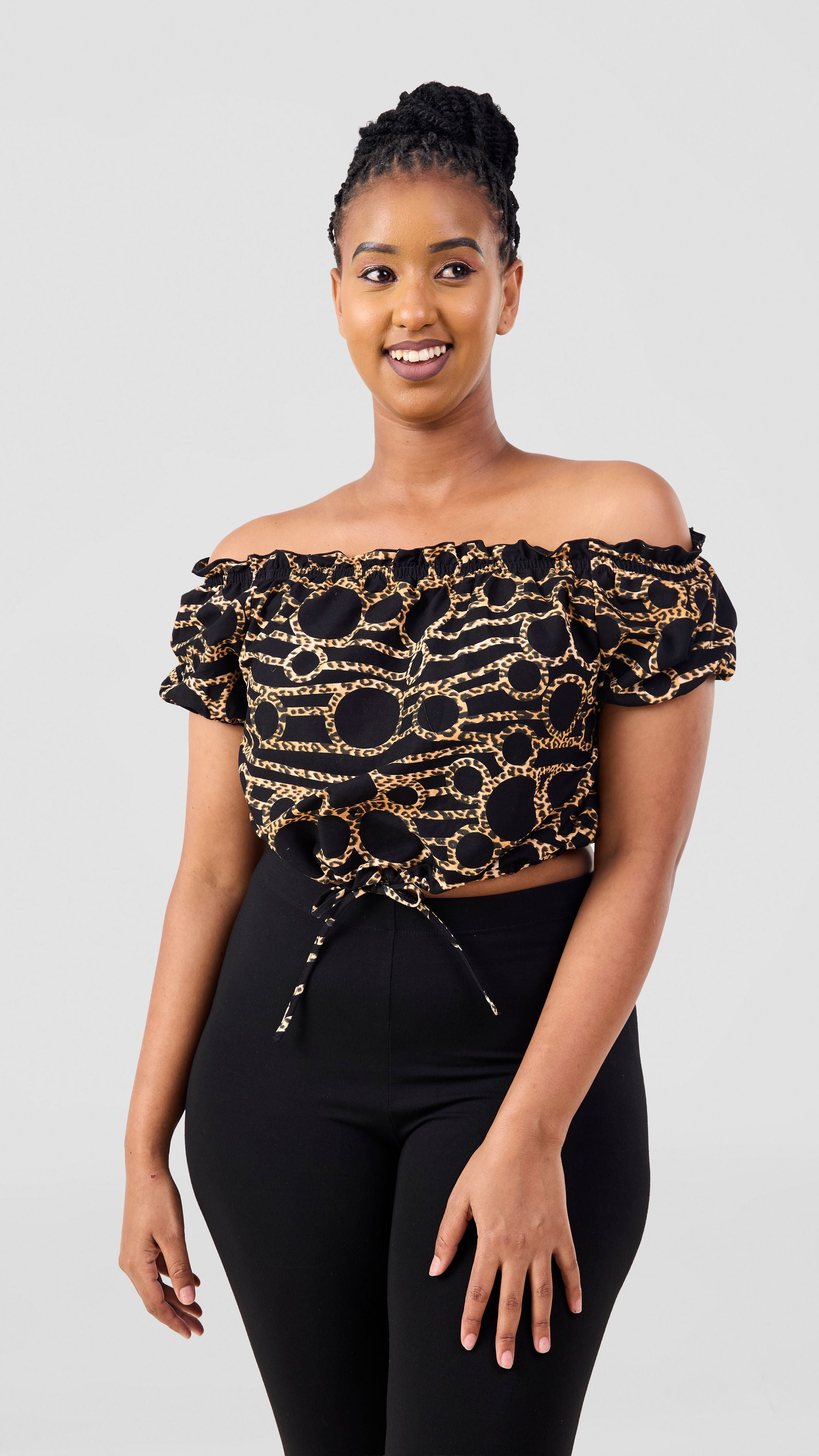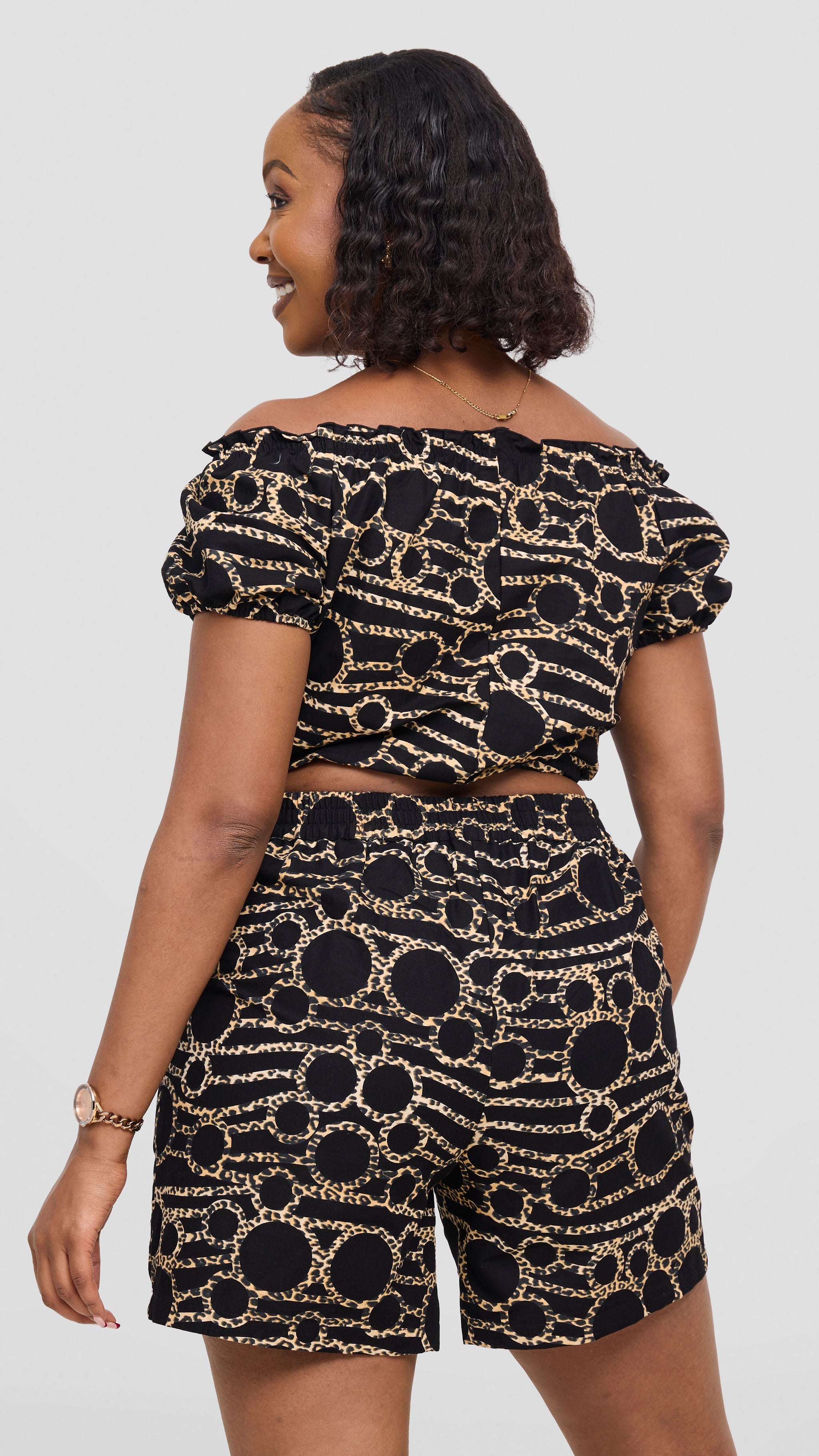 Rock the Safari Tafari Off Shoulder Crop Top in black brow shade c print piece is all about fun and freedom, wear it solo with your favorite jeans, team it up with the matching shorts for a coordinated look, or get creative and pair it with literally anything in your wardrobe. The off-shoulder cut brings that effortless cool factor, making it the perfect companion for adventures, hangouts, or whenever you want to feel fabulous. Mix, match, and make it yours!