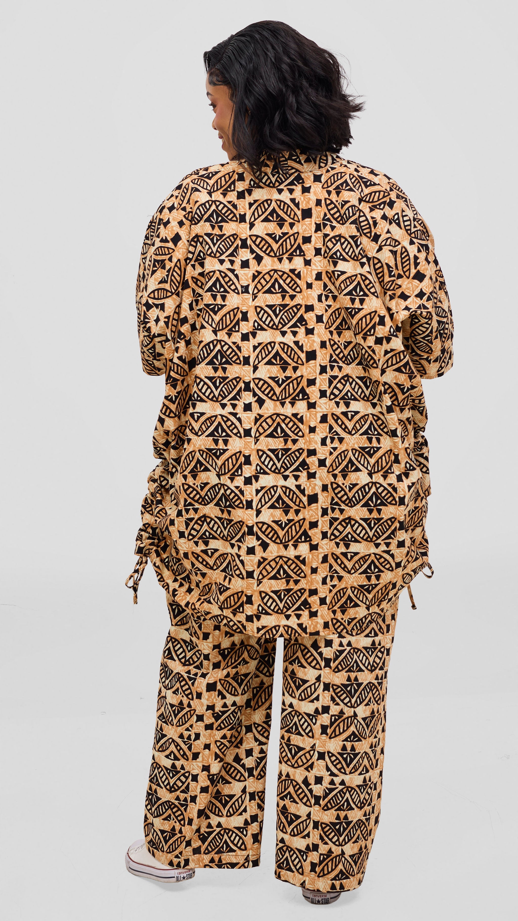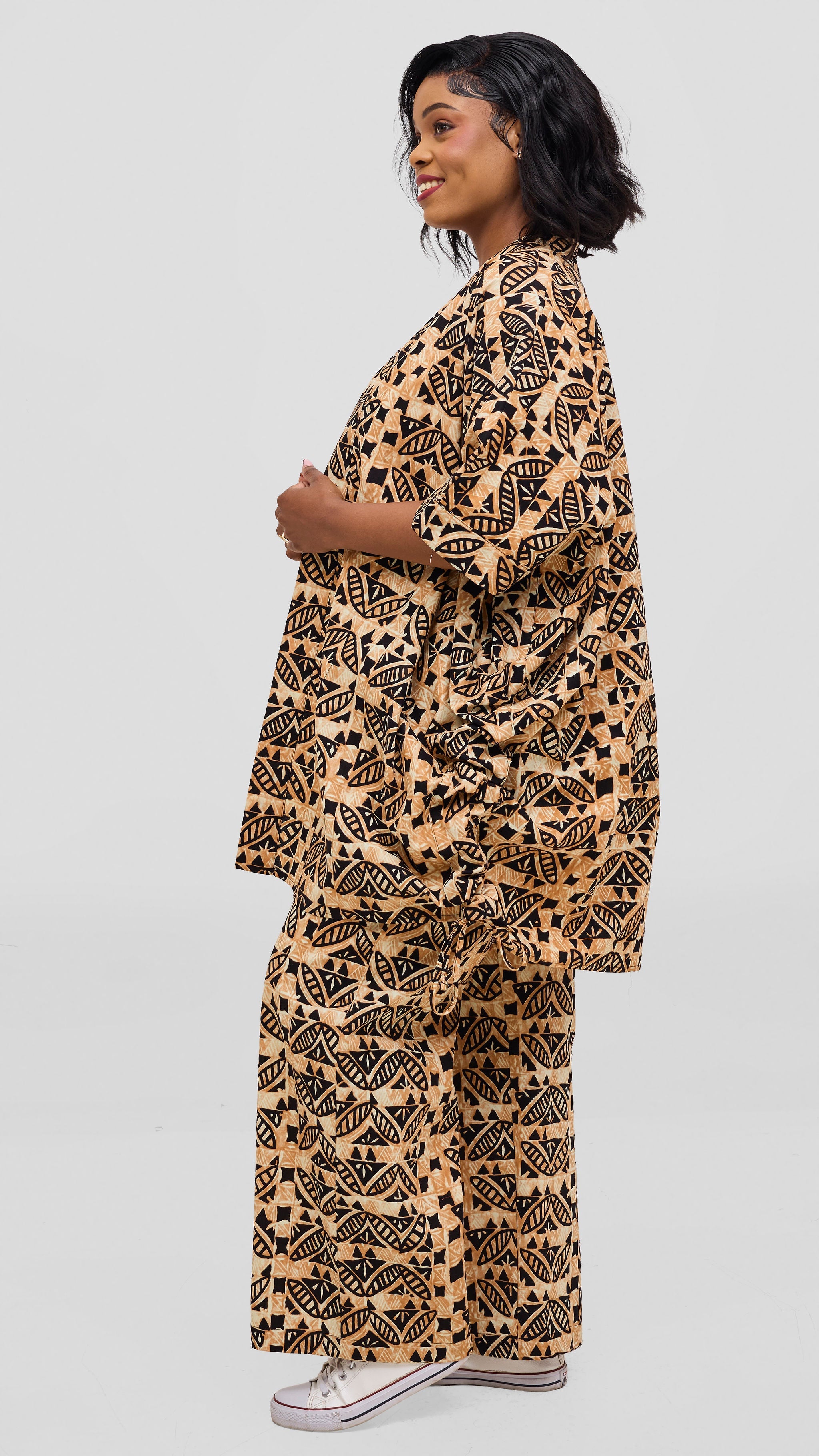 Elevate your wardrobe with this striking kitenge short kimono, crafted from authentic Kosi print fabric. The versatile silhouette pairs effortlessly with matching pants for a coordinated ensemble, or layer it over shorts and casual pieces for an understated, polished look. Perfect for those who appreciate bold patterns and refined styling, this piece transitions seamlessly from day to evening wear.