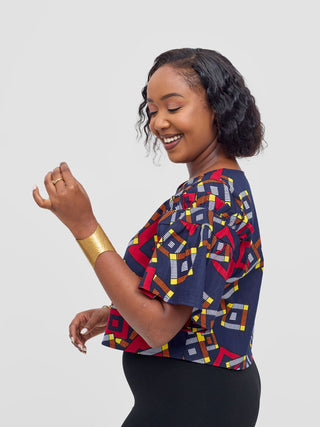 Safari by Vivo Anga Puffy Short Sleeve Tie Top - Navy Blue / Yellow Ankara Print
