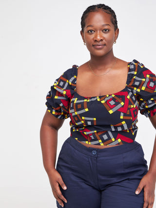 Safari Anga Puffy Short Sleeve Tie Top - Navy Blue / Orange Ankara Print