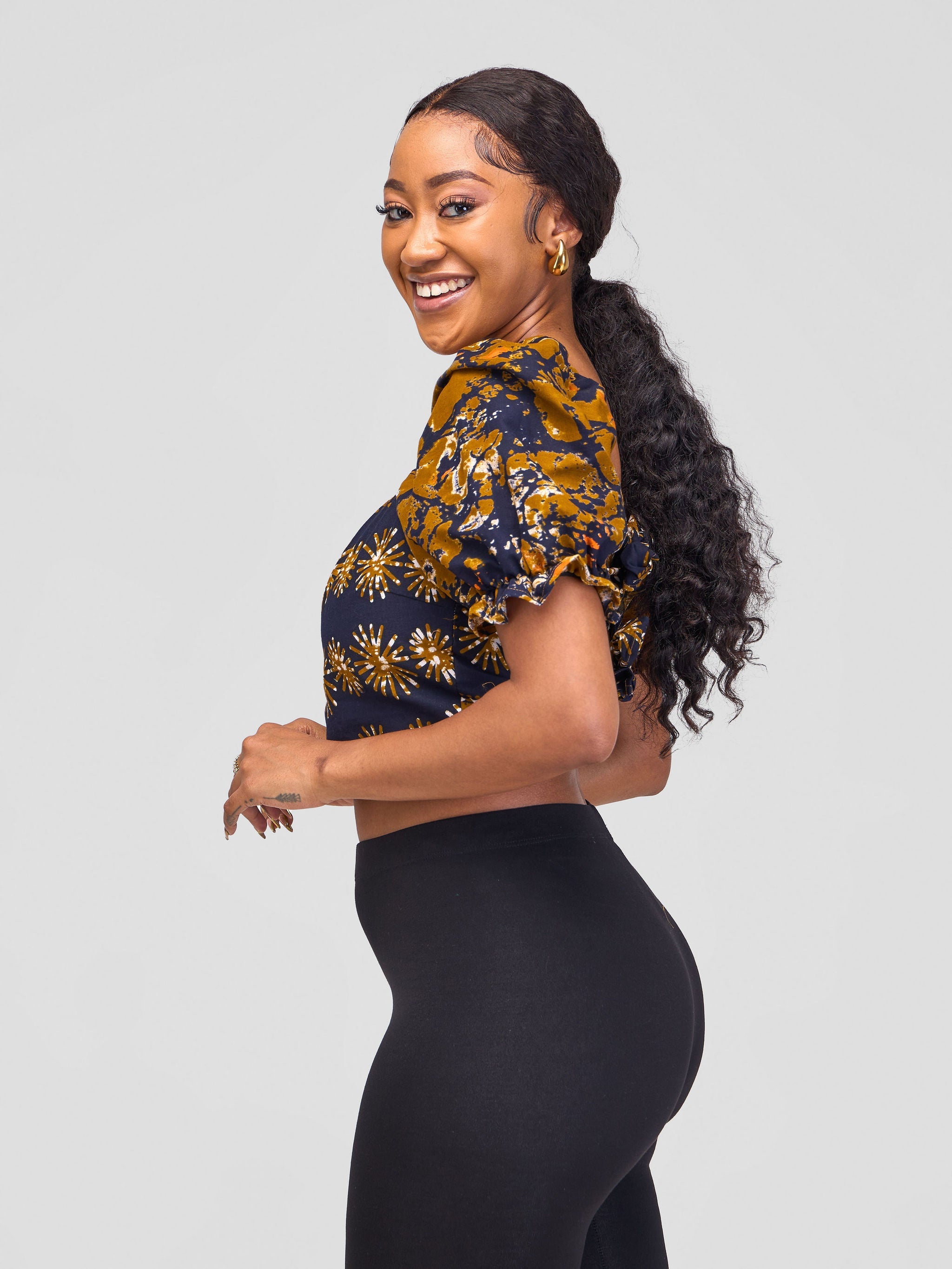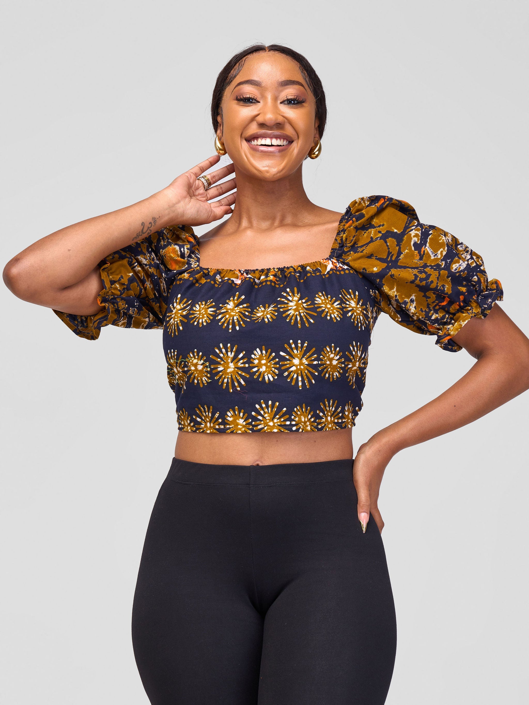 Safari Anga Puffy Short Sleeve Tie Top - Dark Mustard / Navy Blue Ankara Print